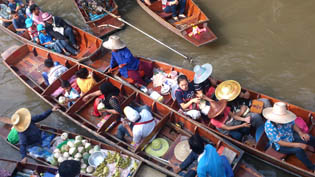 ローカルツアーで参加しました。バンコクからは30~40分位バンに揺られました。先ず船着き場で乗船、左右のバランスを取るために同じ体重の人が左右に均等になる様に組み換えられました。水路をスピードを上げしばらく疾走したあと水上マーケットエリアに上陸しました。向いのブロックに渡るにも別料金でびっくり。お土産も割高でした。
