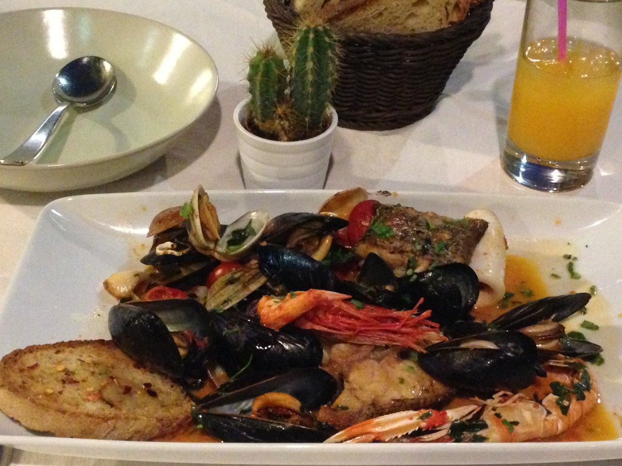 前菜をパスして、魚介蒸しを頂きましたが(メニュー名はズッパだったかな)、「美味しさは保証するわよ」「あなたならこれとパンで十分な量だと思うよ」、と、メインとジュースだけの注文にも快く応じてくれました。