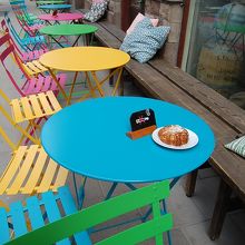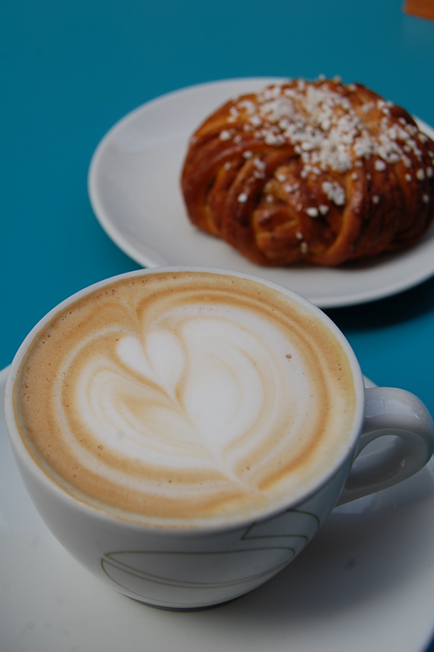 外のテラスに座ってカプチーノとシナモンロールを頂きました。これらの相性がよくおいしかったです。