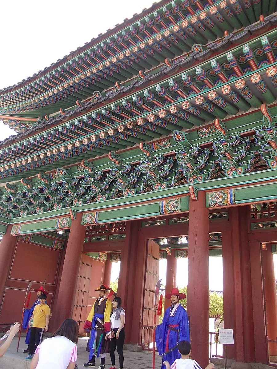 弘化門はソウル王宮の一つ昌慶宮の正門です。正門としては南ではなく東側を向いているのが珍しいです。かなり大きな門で、何層もの屋根に施された装飾を見ていると目がクラクラしてきそうでした。門には伝統衣装の門番役の人が立っていて記念撮影に応じてくれます。