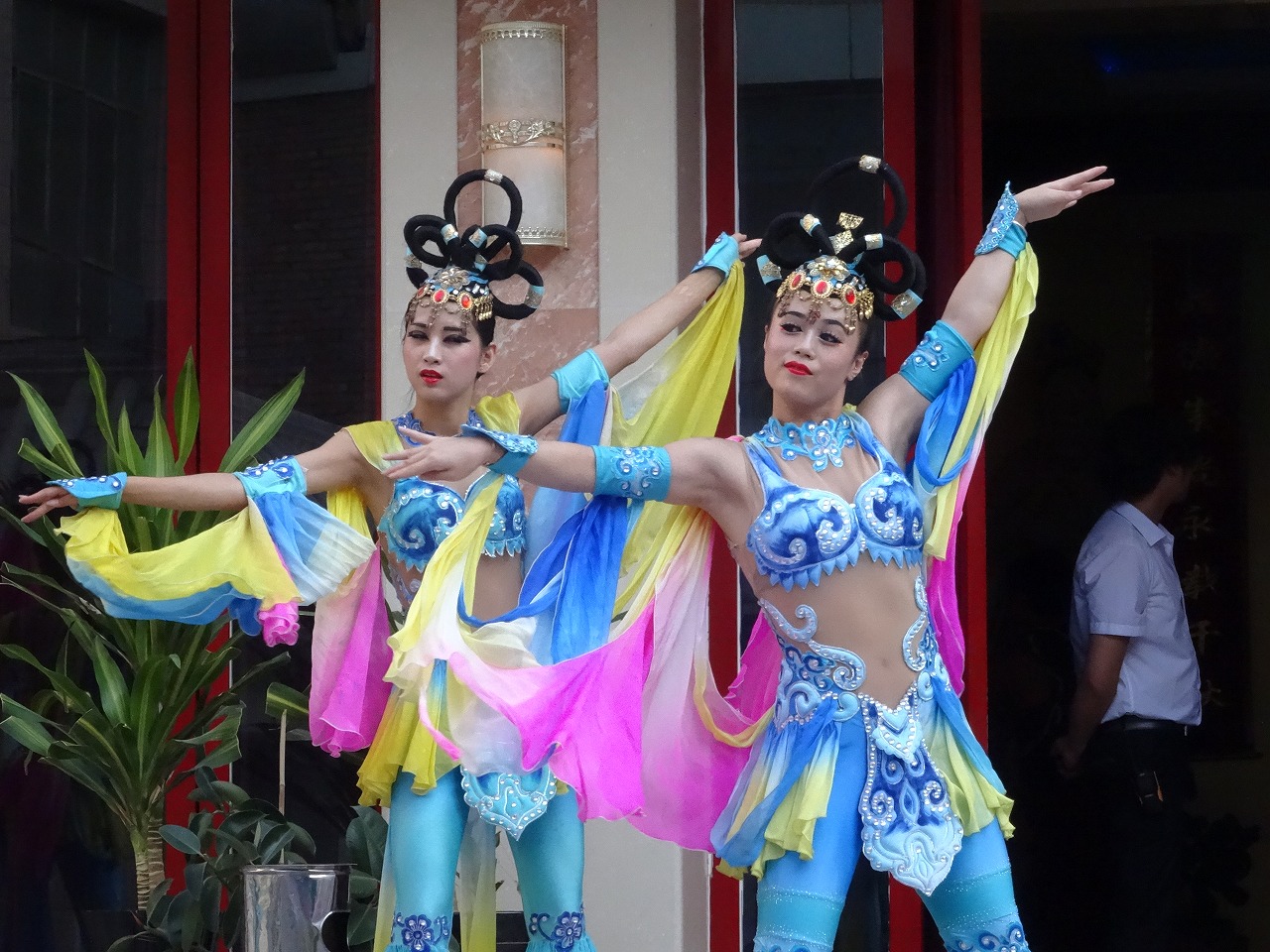 ★「敦煌大劇院 (トンコウダイゲキイン)」敦煌で千手観音の舞台を観に行きました。開演前に、劇場の前でパフォーマンスがありました。舞台は、物語性のある劇と雑技など、バラエティに富んでいました。1時間半ほどで200元(4000円)でした。
