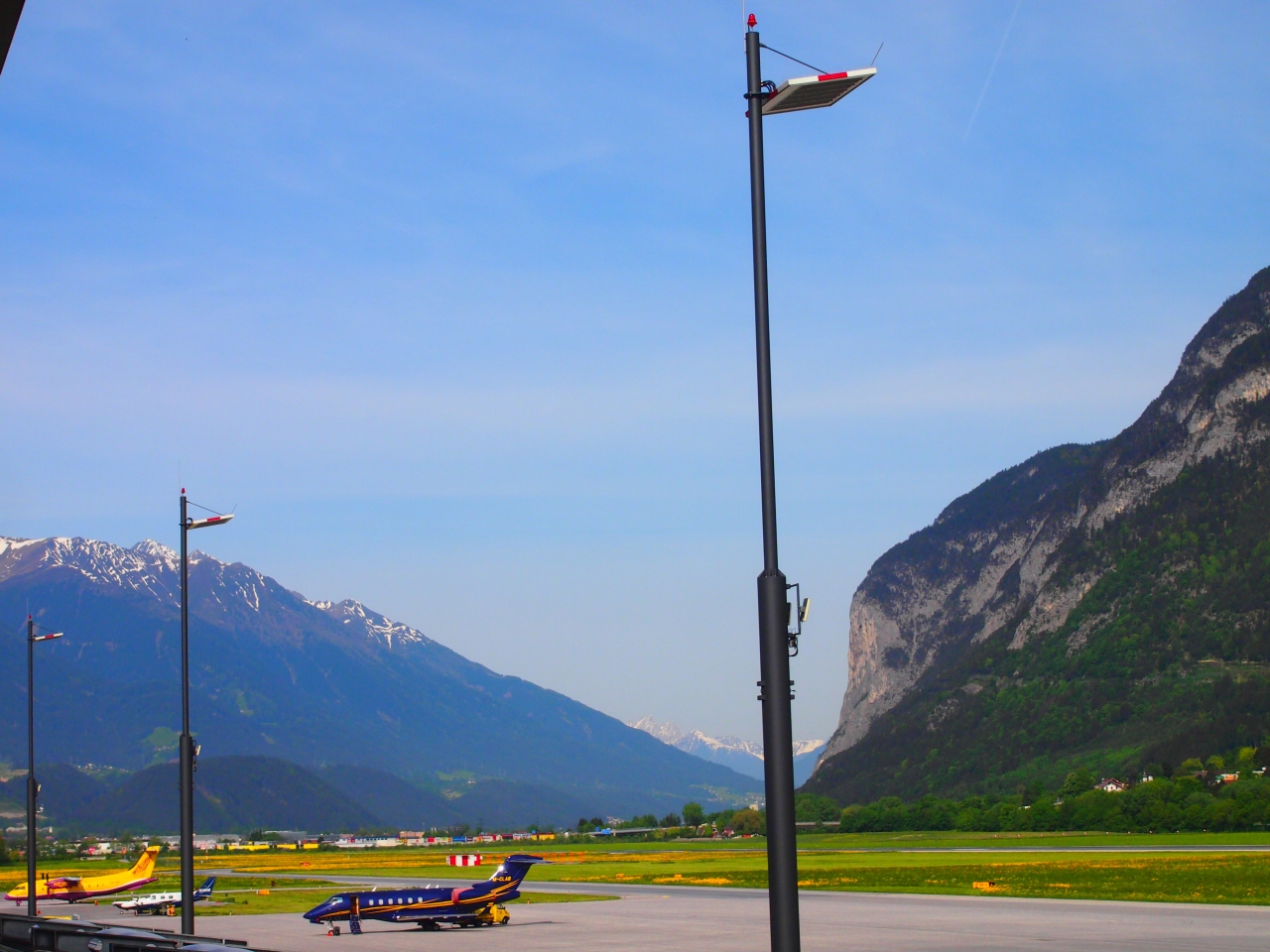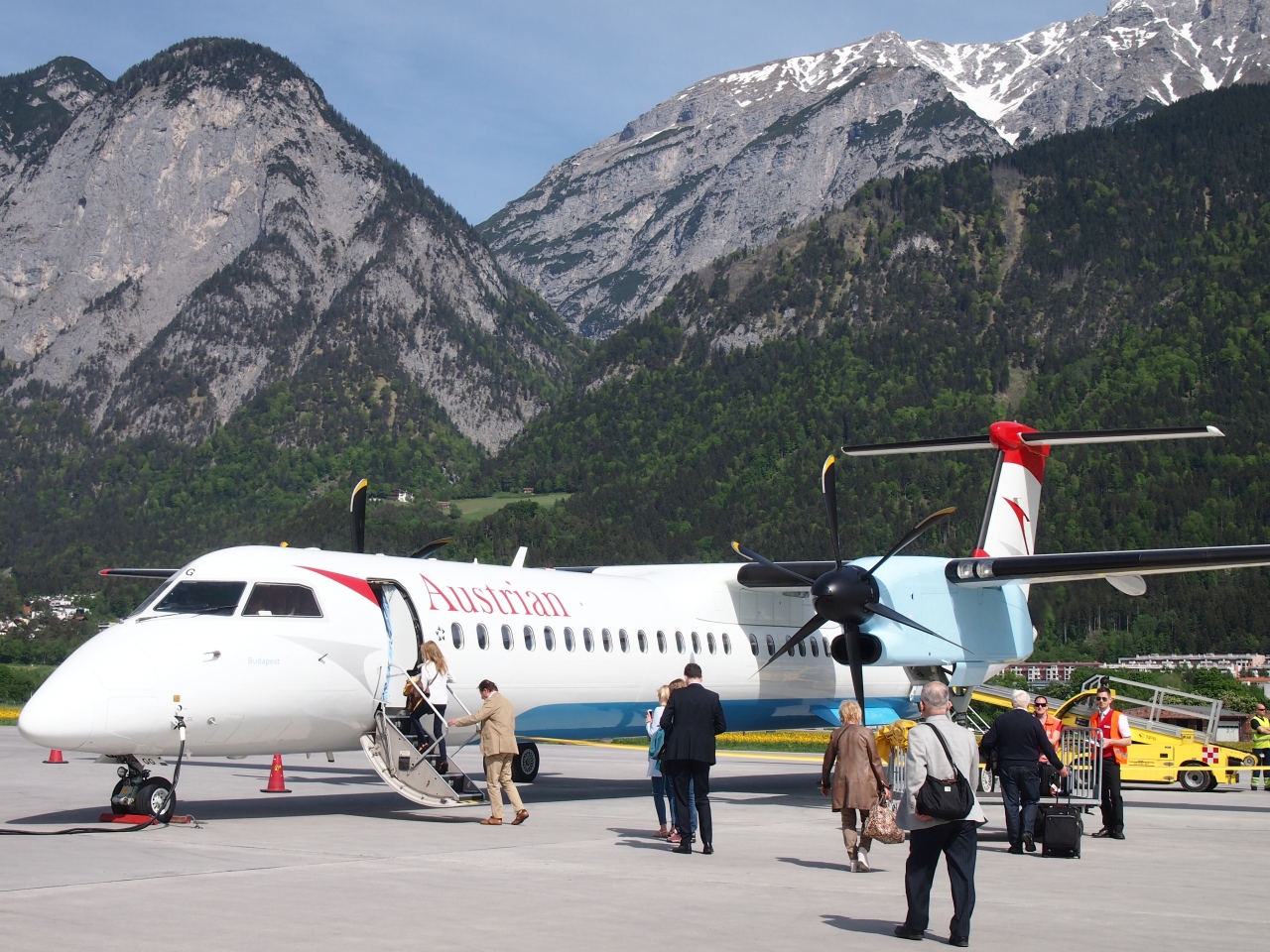 こじんまりした空港。 展望デッキからは、飛行機+チロルの山並みの景色を楽しんで♪