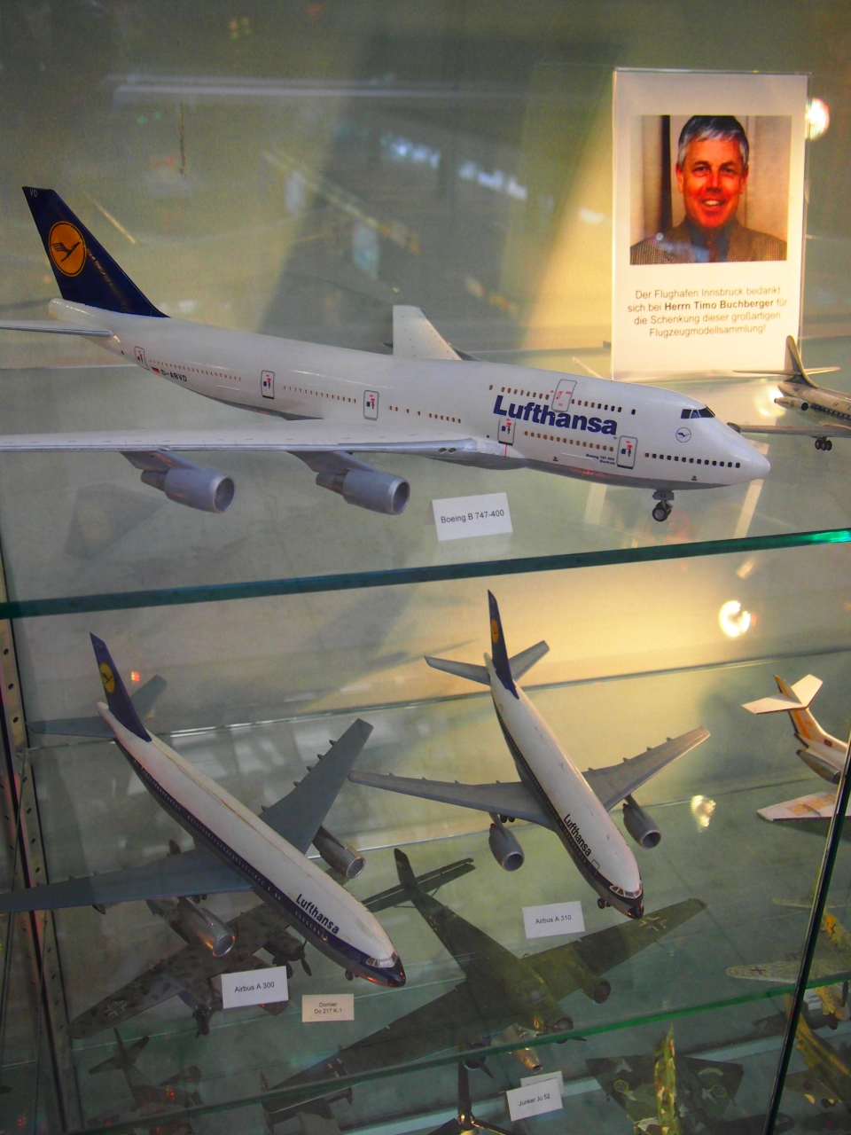こじんまりした空港内は、カフェというか、食堂っぽいレストランはありましたけど、それ以外は特別楽しい施設はなく。 インスブルック空港が出来るまで…を説明したパネルや飛行機の模型が展示されてるスペースが2Fにあるので、時間つぶしには面白いですが、ほとんどドイツ語なのであんまり理解できなかったです。
