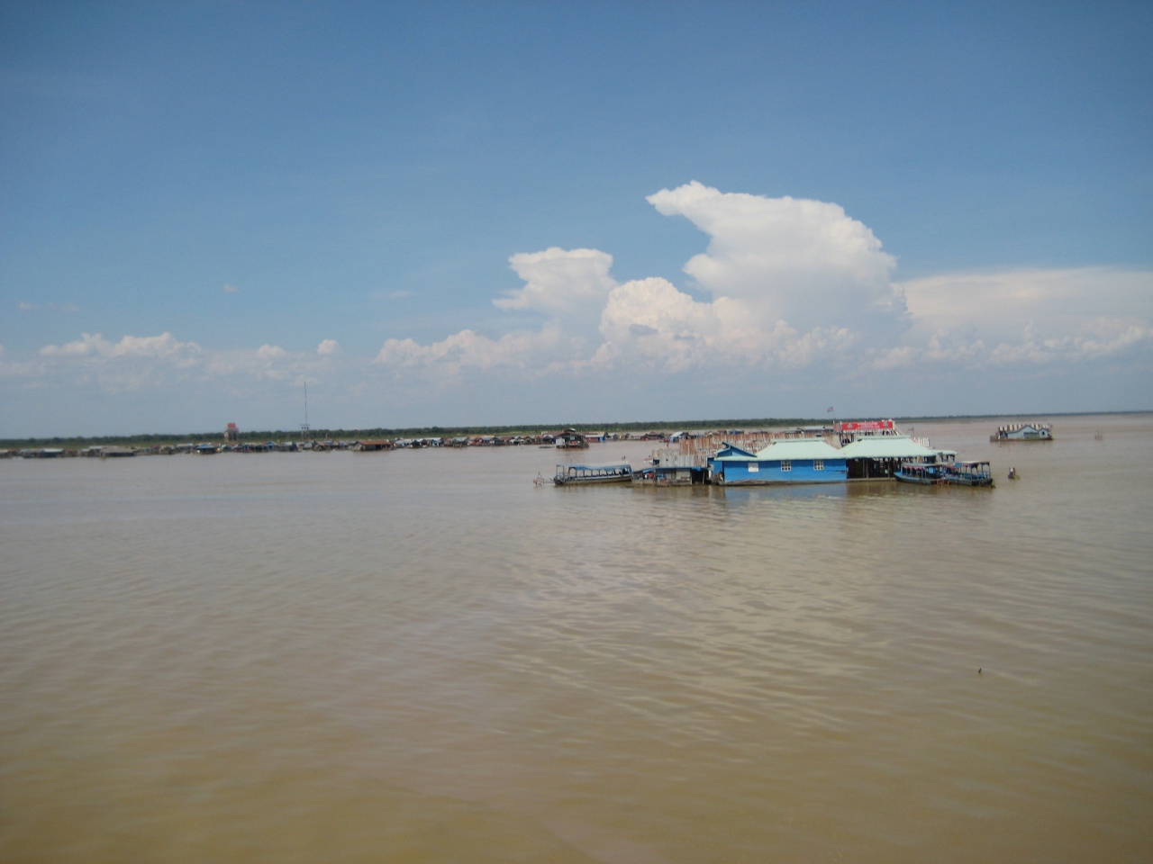 シムリアップ郊外にある東南アジア最大の湖で、400種以上の淡水魚が生息しているそうです。訪問時は乾期の終わりごろで、水位がかなり低下していて、ツアークルーズ船への乗り降りに苦労しましたが、水上で生活している人々の村を見学することができました。湖の水位は雨期と乾期とで2~3倍異なるようですが、水位に合わせて調整できるようなシステムが村の構造物には施されているのには、驚かされました。