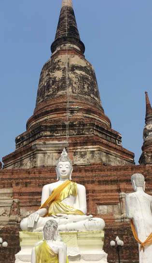 並べられたお揃いの袈裟を纏った仏像群は有名ですね。アユタヤの遺跡群は破壊の跡が激しいですがこの仏塔は良く保存されていて階段で上まで登ることができます。回りに巡らされた回廊からは遺跡群一望することができ、眼下には仏像群が仏塔の回りを囲んでいます。