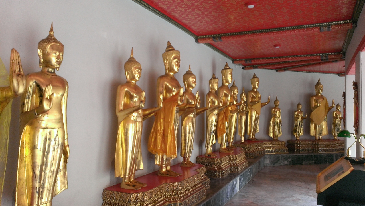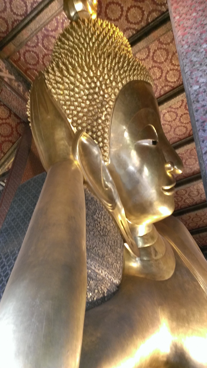BTSのサバーンタクシン駅を降りて、近くの船着場から船(オレンジの旗)に乗って(15バーツ)ターティエンの船着場(8番)まで行きました。船着場の目の前にあるのですぐに行けます。そんなに広くはないですが綺麗な王様のお墓や、金ピカの仏様がいっぱいで涅槃以外でも見ごたえがありました。残念なことに足の裏は修復中で見れませんでした。入場券は100バーツでお水のFreeチケットがついています。