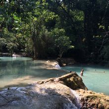 いくつもの小さな滝がつながる美しい渓流。エメラルドグリーンの自然のプールが棚状につながっており、その中で泳ぐことができる。市内からはミニバスツアーで7万キープだった。滝へ至る途中には熊の保護センターがあり、多くの熊を見ることができる。滝のそばはとても涼しく、暑い日には最良。