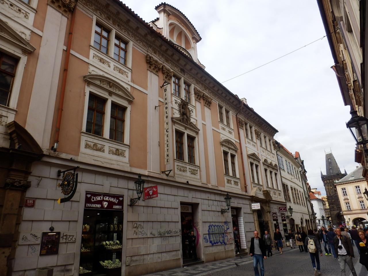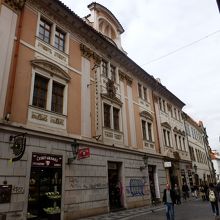 火薬塔から旧市街広場へ繋がる道がこちらのツェレトナー通りです。王の道の一部となってます。石畳の細い通りですが、観光客が大勢行き交っていて、すれ違う際には歩道から車道へはみ出てしまうこともありました。通りには、ボヘミアガ ラスのお店や、Tシャツやマグカップ等をお土産屋さんがずらっと並んでいました。が、私が気になったのは鮮やかな黄緑色のタイマッサージ店です。チェーン店のようで、近くに数店舗あり、盛んに呼び込みされてました。何故、チェコの観光地の中心でタイマッサージなのでしょう?不思議でした。