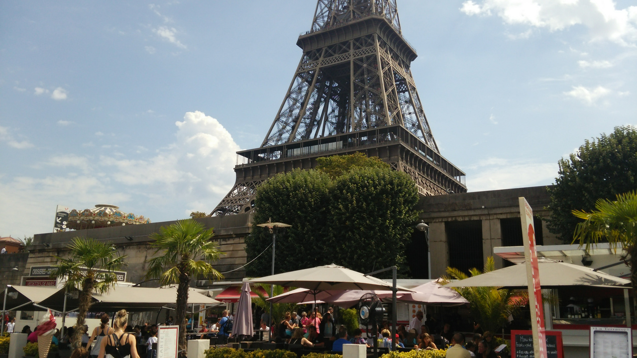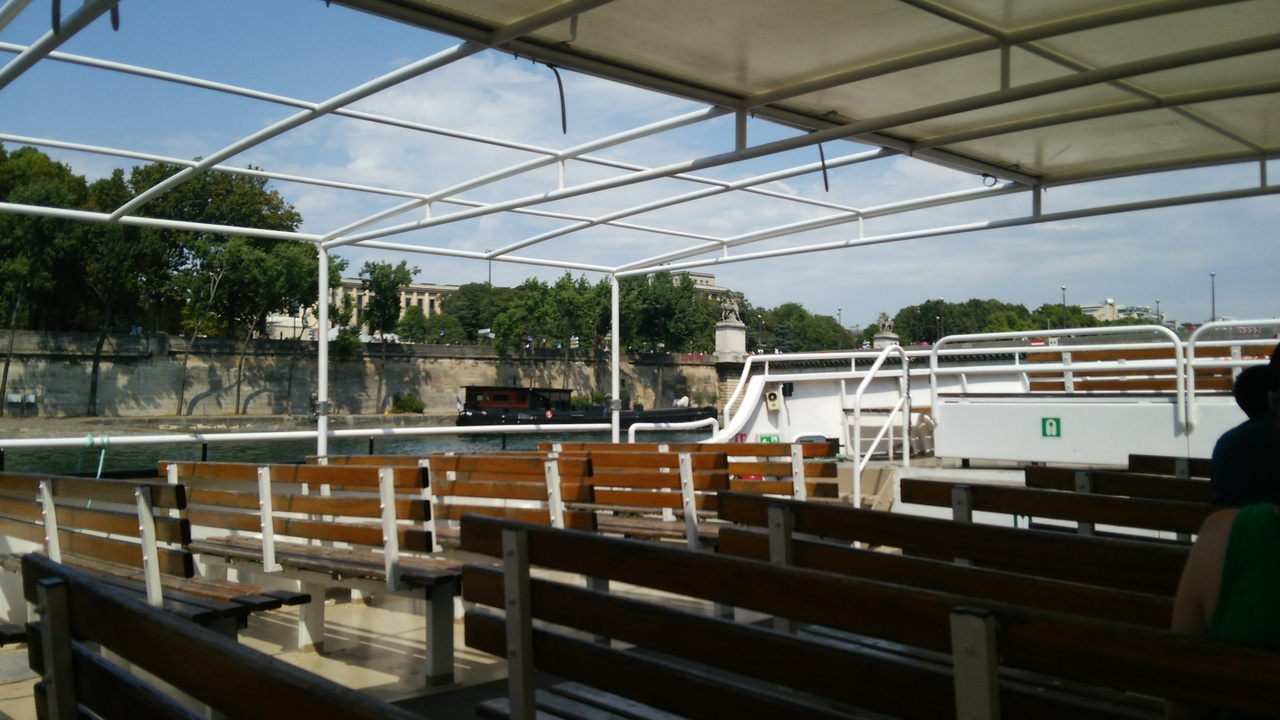 エッフェル塔の直ぐそばにある乗り場からクルーズに乗りこみました。右半分は布の屋根がありましたが、左半分は屋根がありませんでした。当日は非常に天気がよく、ほとんどの人が日差しを気にして右側の屋根がある側に座っていました。右側に座っても、折り返しで帰りは反対側になるので大丈夫です。