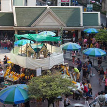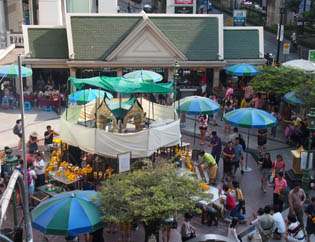 バンコクの有名なパワースポットにして観光名所、エーラーワン(エラワン)の祠。多くの人が花や供物を購入してお供えをしています。ヒンデゥー教のブラフマーを祀っているそうです。一定時間おきに伝統舞踊が頻繁に行われています。