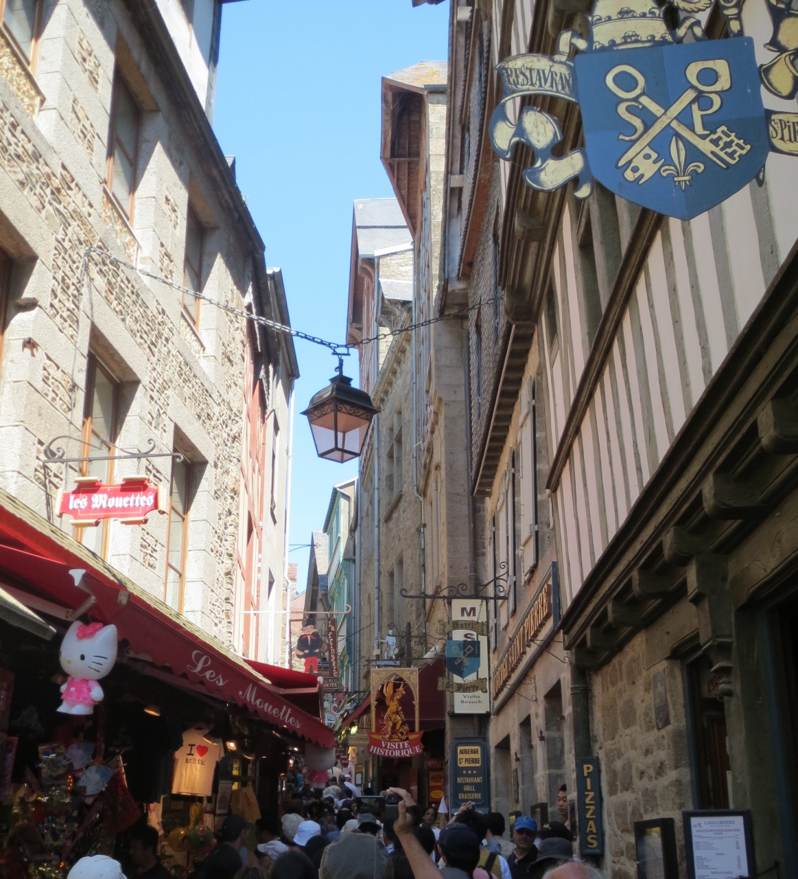 パリからバスツアーで行きました。途中車窓からモンサンミッシェルが見え始めると徐々に気分が盛り上がってきました。シャトルバスに乗り換えて降りた先には、写真で何度も見たあの景色が待っていました。修道院の途中の道の土産物屋付近はたくさんの人でごった返していました。修道院の中庭のような所の一角にミッキーのような形の装飾があります。ガイド付きでないと自分で見つけるのは難しいかもしれませんが。
