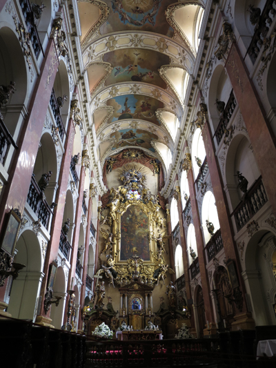 旧市街広場で旧市庁舎を背に立つと、ティーン教会の手前にレストランが見えます。この中を突っ切っていくと、教会の入口になります。お店の中を通り抜けてよいのかと躊躇いましたが、他にもそういう人が意外といました。教会の内陣や祭壇はとても美しかったですが、ミサが始まる直前だったので、あまりじっくり見れなかったです。