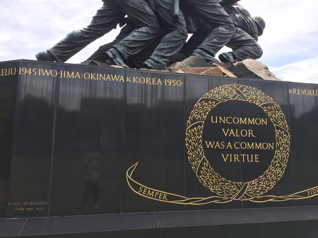 像自体は硫黄島に星条旗を立てるワンシーンを切り出していますが、米国海兵隊の記念碑なので、海兵隊が活躍したあらゆる戦争の名称が当該像の下に延々と彫られています。
