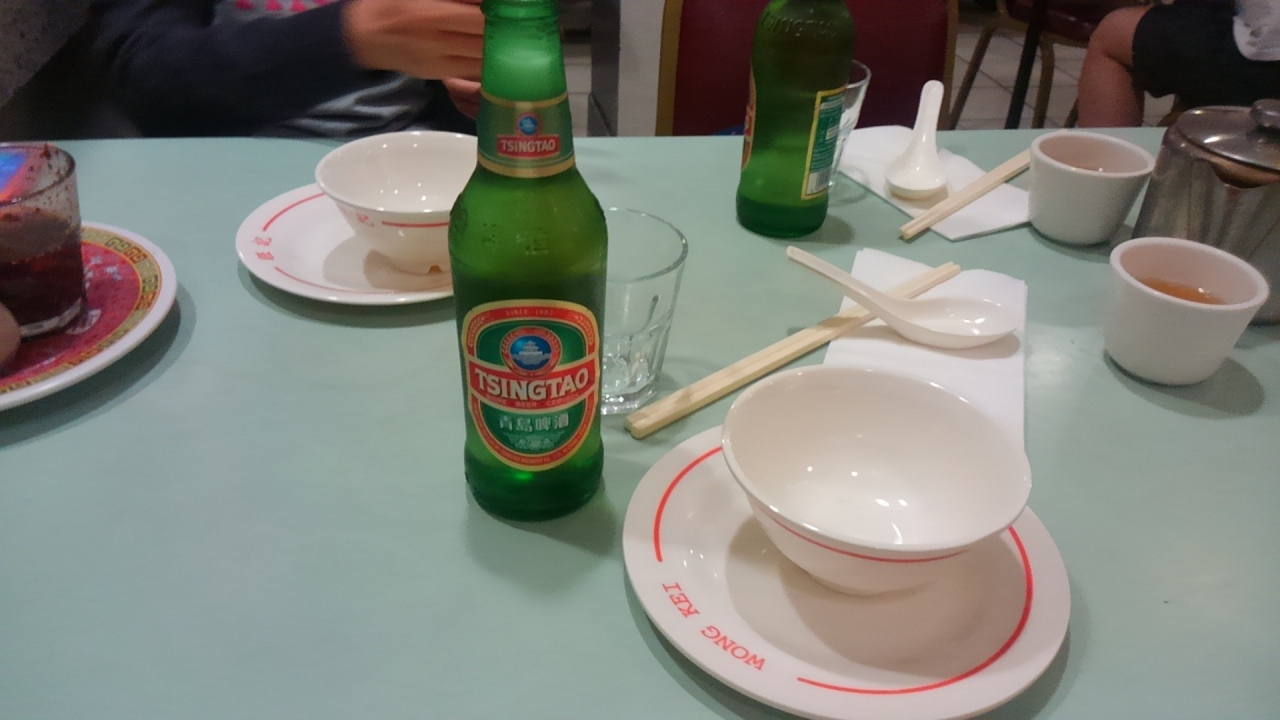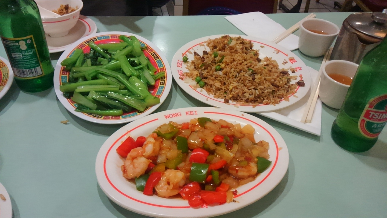 青島ビール3本と青菜の炒め、エビのチリ炒め、牛肉チャーハンを食べ、料金は31GBPでしたがチップ込で40GBP要求されました。