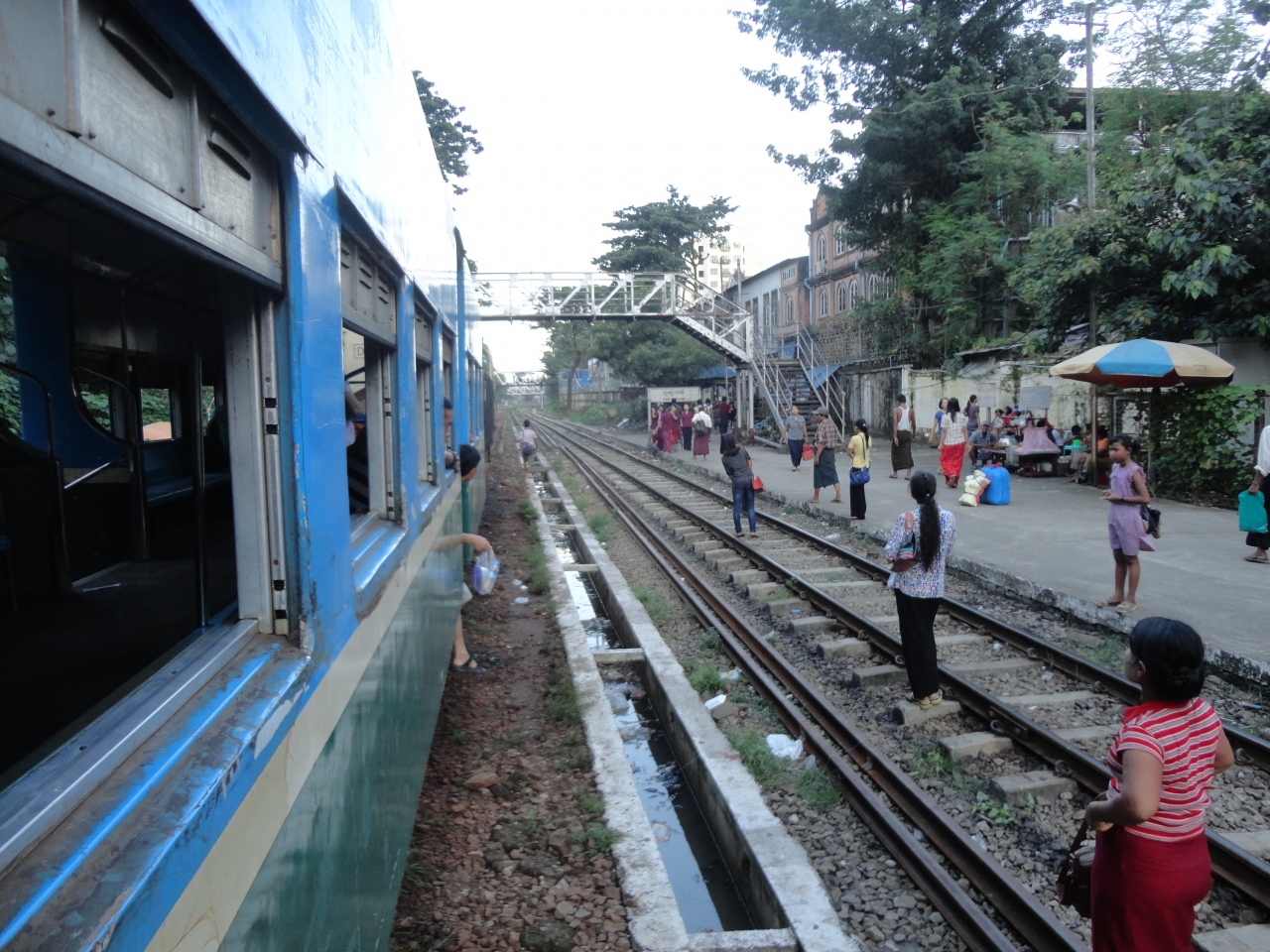 ヤンゴン環状線に一駅だけ乗車。切符はホームで売っていました。一駅なら200チャット。路線バスと同額ですね。車両は扉がなく常に開いている状態でした。線路を直接横断して反対側の列車に乗り込むという、日本ではできないことを体験できます。