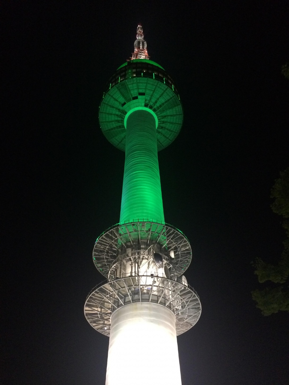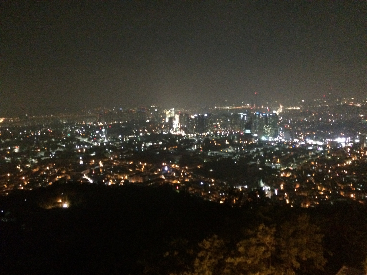 夜遅くに行ったのですが、大勢の人で賑わっていました。ソウルの夜景がとても綺麗で、皆さん夜景をバックに記念撮影をしていました。タワーの麓にはハートマークのオブジェがあったり、中心に向けて斜めに下がったカップル用のベンチがありました。また、双眼鏡がある展望台のフェンスにはビッシリと愛の印の南京錠が付けられていました。ソウルの恋人達のデート・スポットですね。