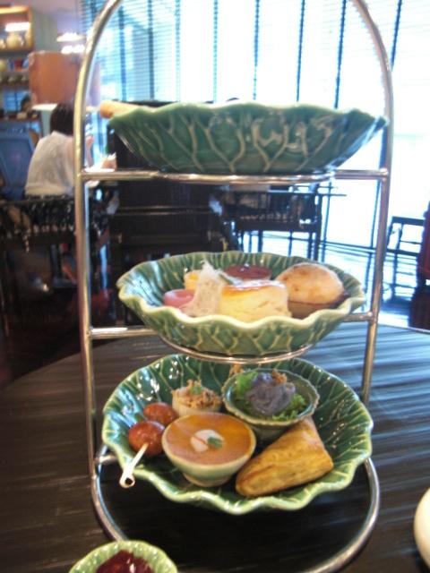 3段重ねのプレートですが、一番下がご飯系の塩味がついているとは気が付かづ、上のデザートのプレートから食べてしまい、順番を間違えました。普段食べない、タイ風のお菓子ということで気が付かなったからです。それでも、雰囲気もよくいい思い出です。