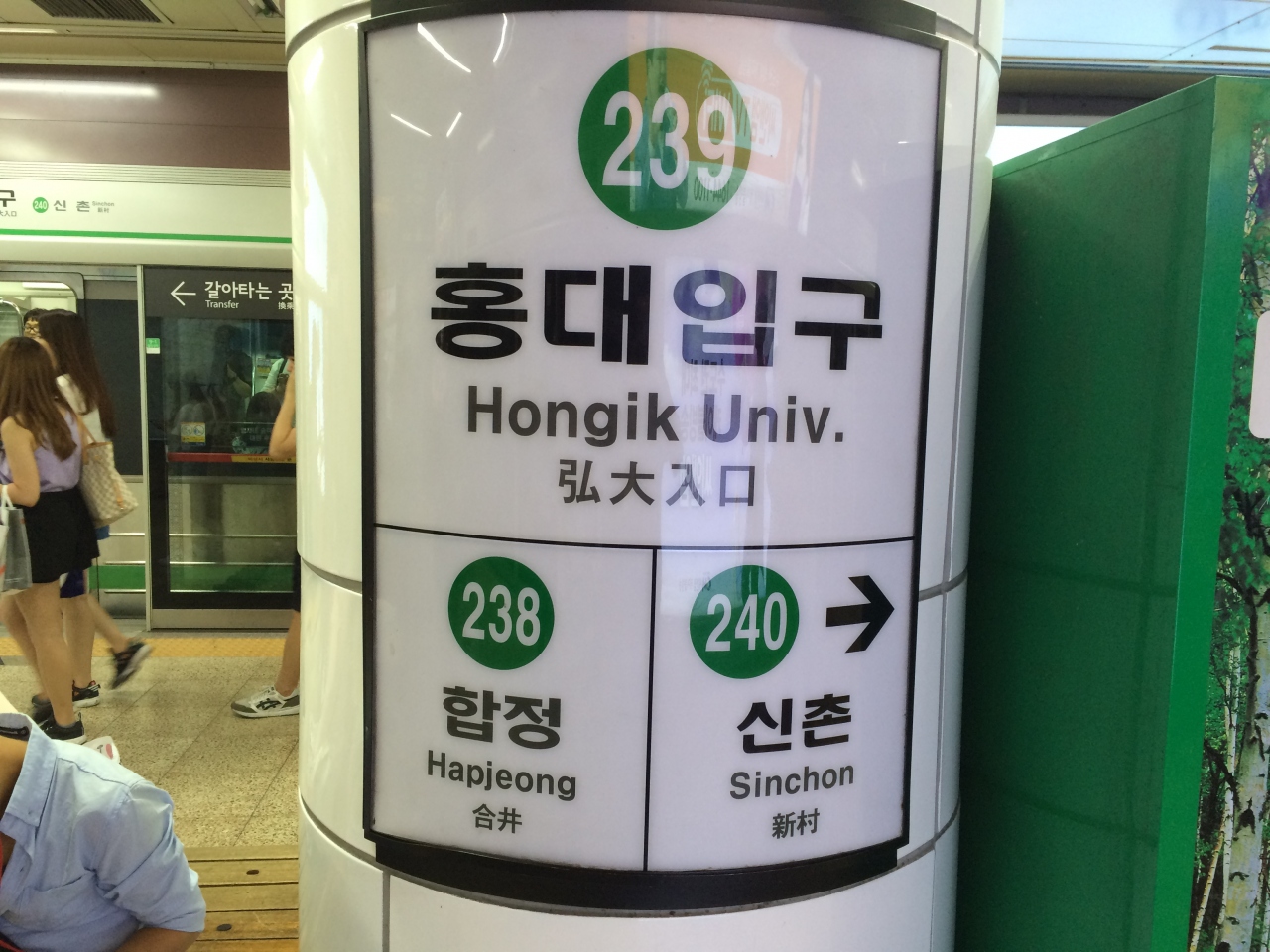 地下鉄2号線と空港鉄道、京義線の駅です。漢字表記は弘大入口ですが、英語表記が「Hongik Univ.」となっており分かりにくかったです。弘益大学が芸術大学なためか、駅の周りに停まっているクルマやスクーターはヨーロッパ製が多くお洒落な雰囲気でした。売られている衣料品も変わった柄のものが目を引きました。