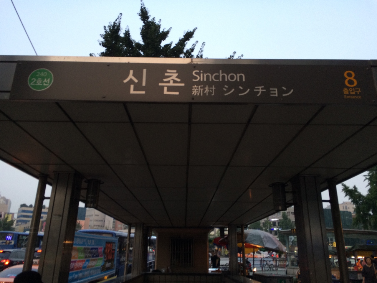 地下鉄2号線の駅です。街は隣の梨大や弘大入口より都会っぽい印象です。百貨店や飲食店などもあり、賑わっていました。銀行のATMでキャッシングをしたのですが、銀行によっては国際クレジットカードを受け付けない機械もありました。