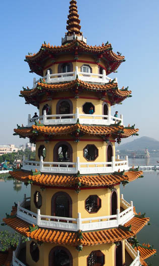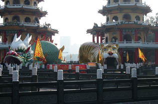 高雄観光のガイドブックには必ず載っている場所ですね。蓮潭湖の湖尻に建つ龍と虎の塔が龍虎塔です。名前の通り龍の口から入って虎の口から出ると願いがかなうそうです。左営駅から徒歩15分程度と駅の案内に書いてましたがタクシーが無難です。