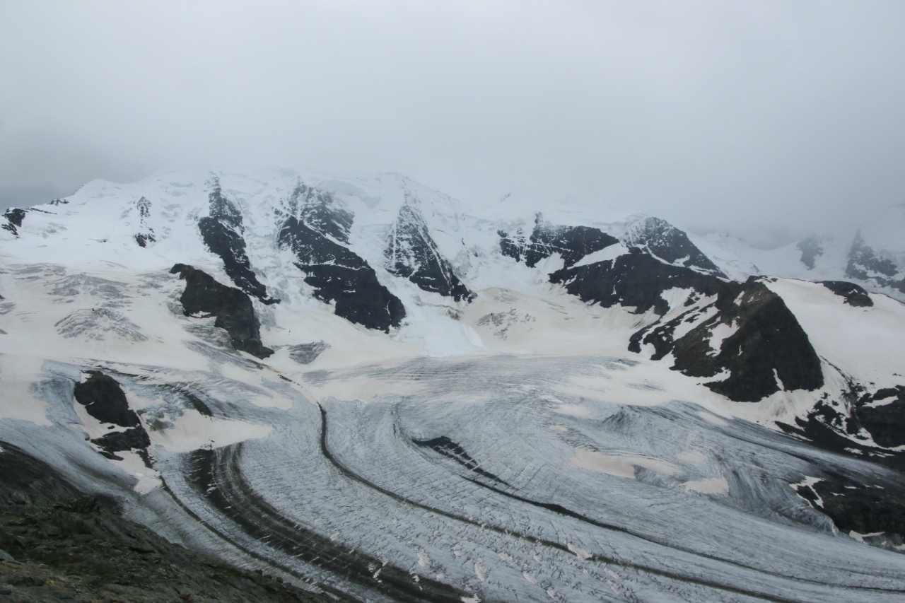 とはいえ、目の前に広がる氷河は大迫力。残念ながら天気が悪くベルニナアルプスの名峰群は山頂が雲に隠れてしまっていましたが、巨大な氷河には感動しました。