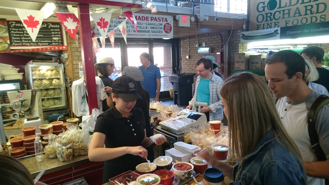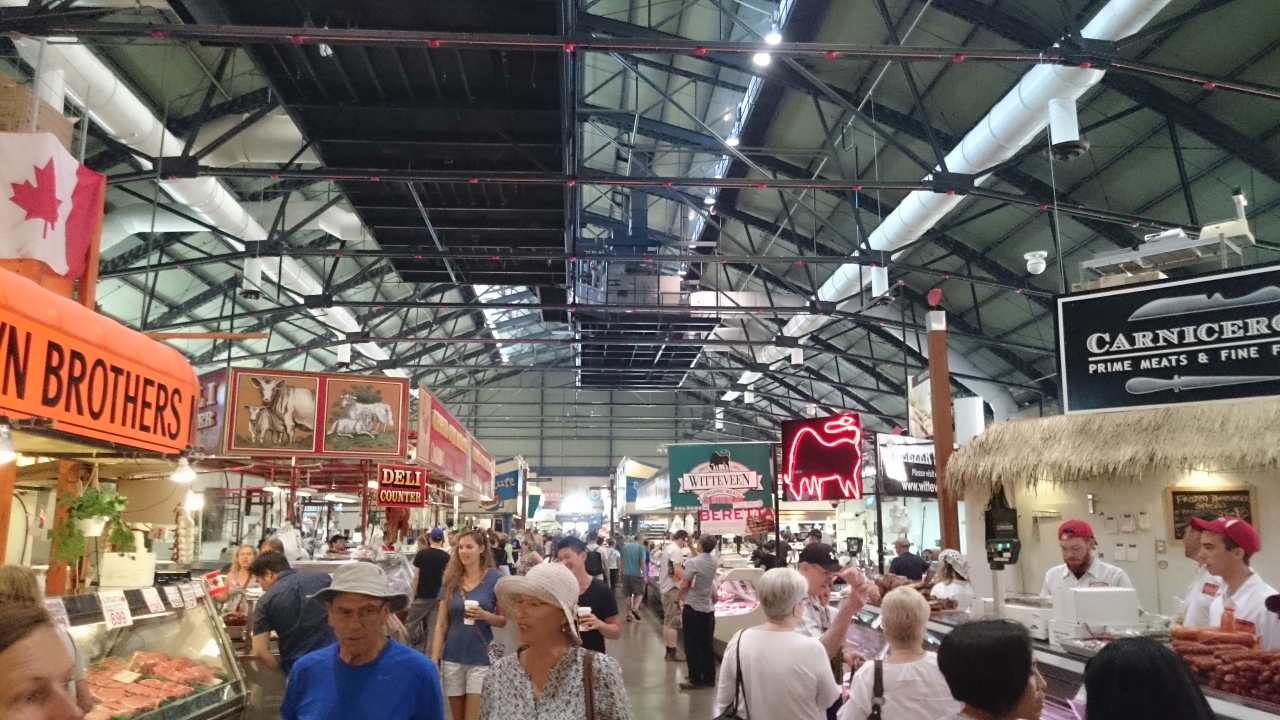 200年以上も前からトロント市民の台所として賑わっている市場で、通りを挟んで毎日営業している南棟と週末だけ営業する北棟があります。レンガ造りの建物は、初代の市庁舎を改築したもので、2階建てのフロアには、野菜や肉、魚など地元でとれた新鮮な食材をはじめ、オーガニック食材の専門店、人気のデリカテッセン、ベーカリー、さらにはお土産屋さんなど120店以上あります。市場の中にはイートイン・スペースもあるので、ランチも可能です。中でもピーミール・ベーコンサンドイッチなどが食べられるファスト・フード店は有名。行列ができています。お土産用のメープルシロップなどは空港で買うよりもここで買う方が安いです。