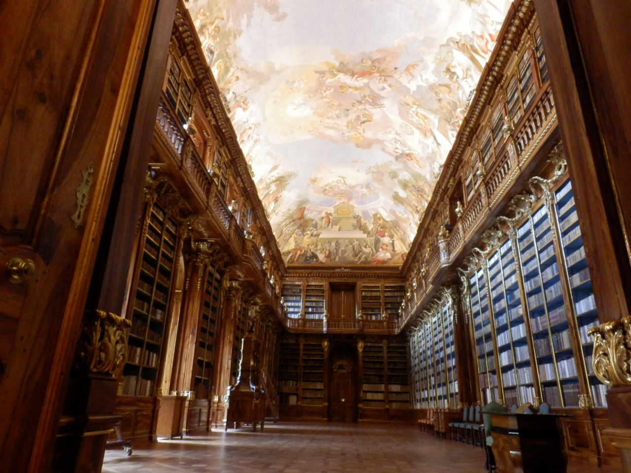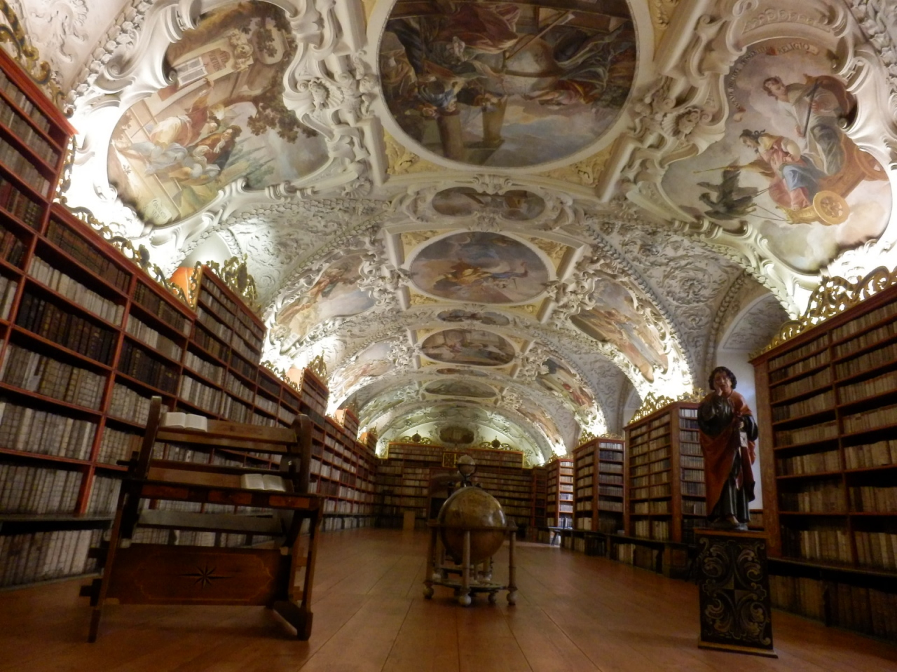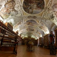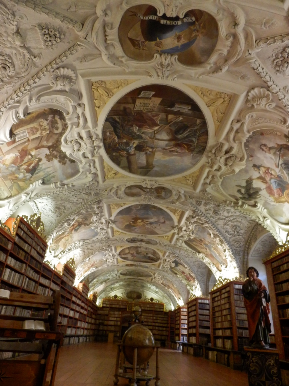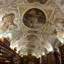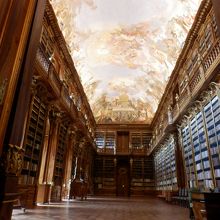 プラハ城の正門から十分ほど坂を上り、他の観光客の後を着いていったら、建物に穴を開けたような狭い通路に入ったので驚きましたが、そこが近道となっていました。修道院にはいくつかの建物がありましたが、見どころは美しい図書館です。建物の入口で入場料を支払うと入れますが、図書室を撮影しようとすると、 別途カメラ代が必要でした。2つの図書室へは入れず、外から眺めるのみなのが残念でしたが、美しさは圧巻でした。