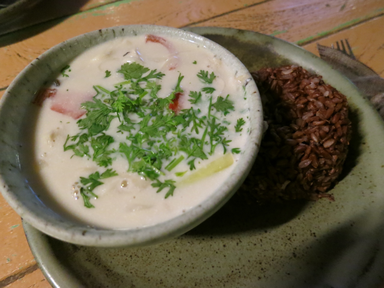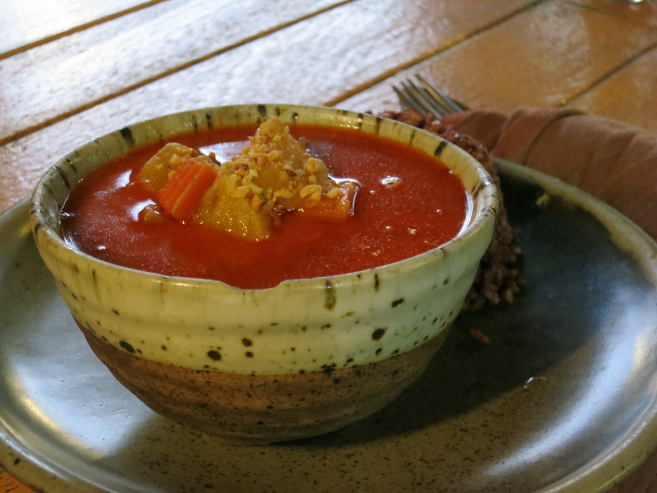 友達が体質改善でベジが食べたいとのリクエストだったので、みんなでこのお店へ。私は初めてだったけど他の友人の行きつけだったみたい。いつもランチはベジが多かったんだけど夜もベジを食べるのは今回が初めてだったかも。メニューは色々あってパスタやタイ料理も。友達のおすすめでトムカーヘッドと黒米。優しい味でパンチが効いている味が好みの人は物足りないかも。友達はマッサマンカレーをオーダーしてたけどそこまで辛くはなくスープカレーのような感じだった。パスタも美味しかったようです^^