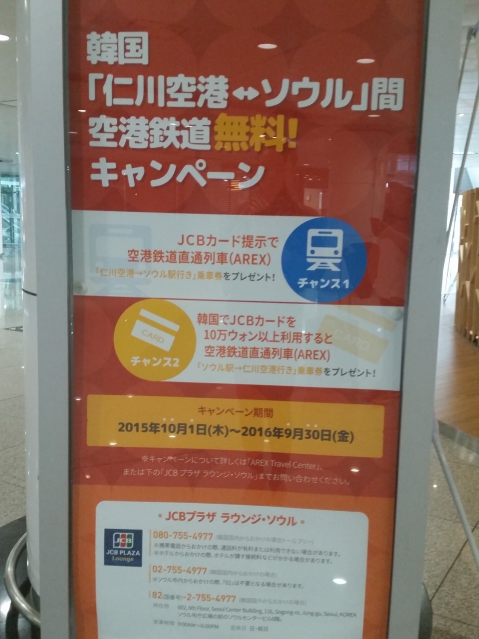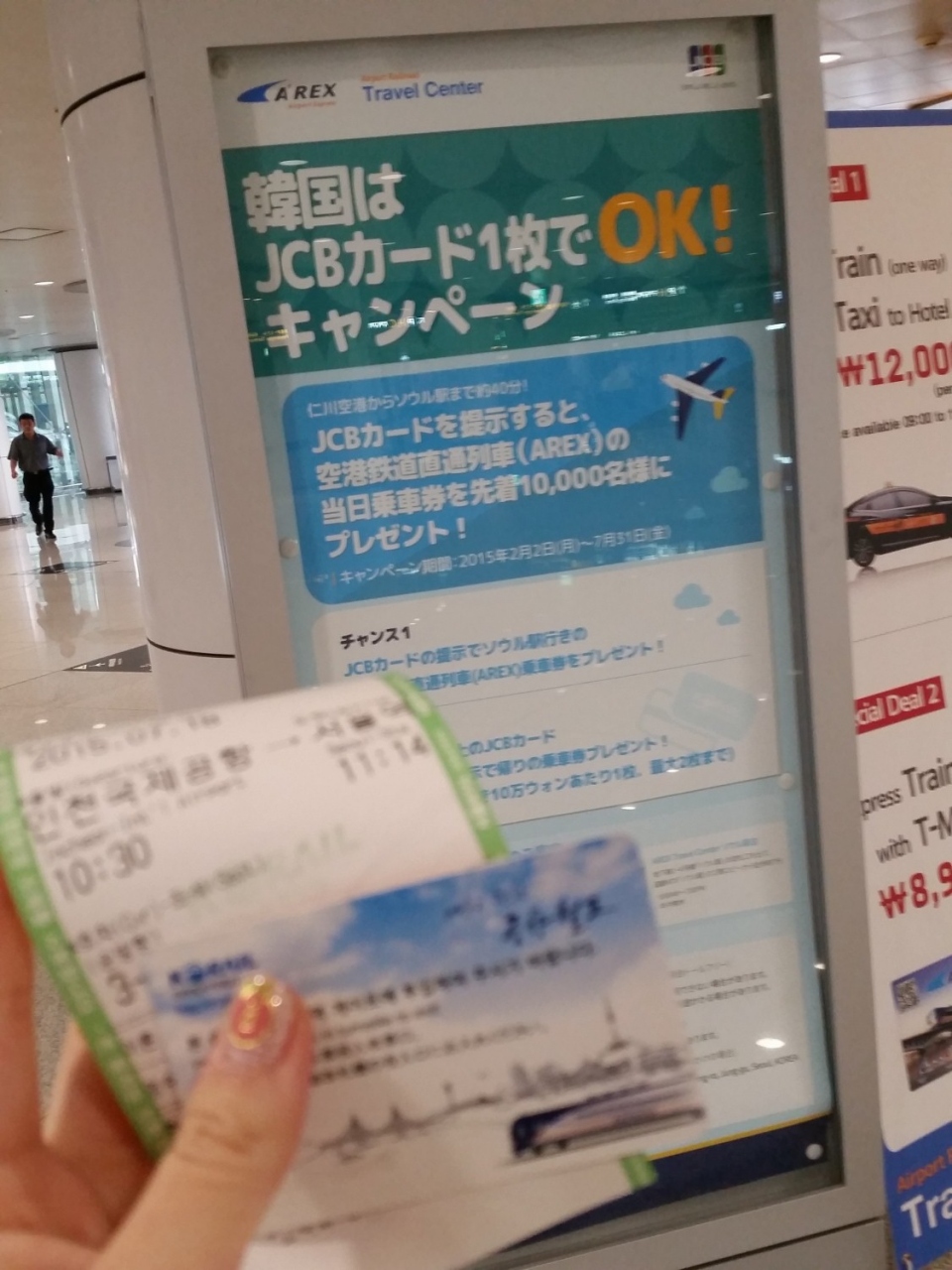 JCBカード提示で仁川空港からソウル駅までの直通列車の切符無料キャンペーンを開催中ですのでカードホルダーの方は市内までお得に移動できます。