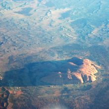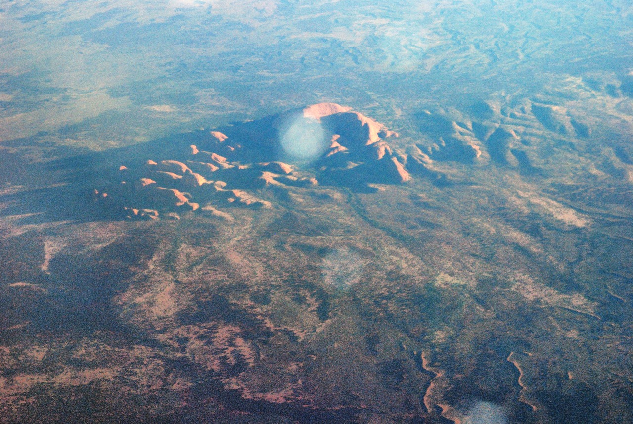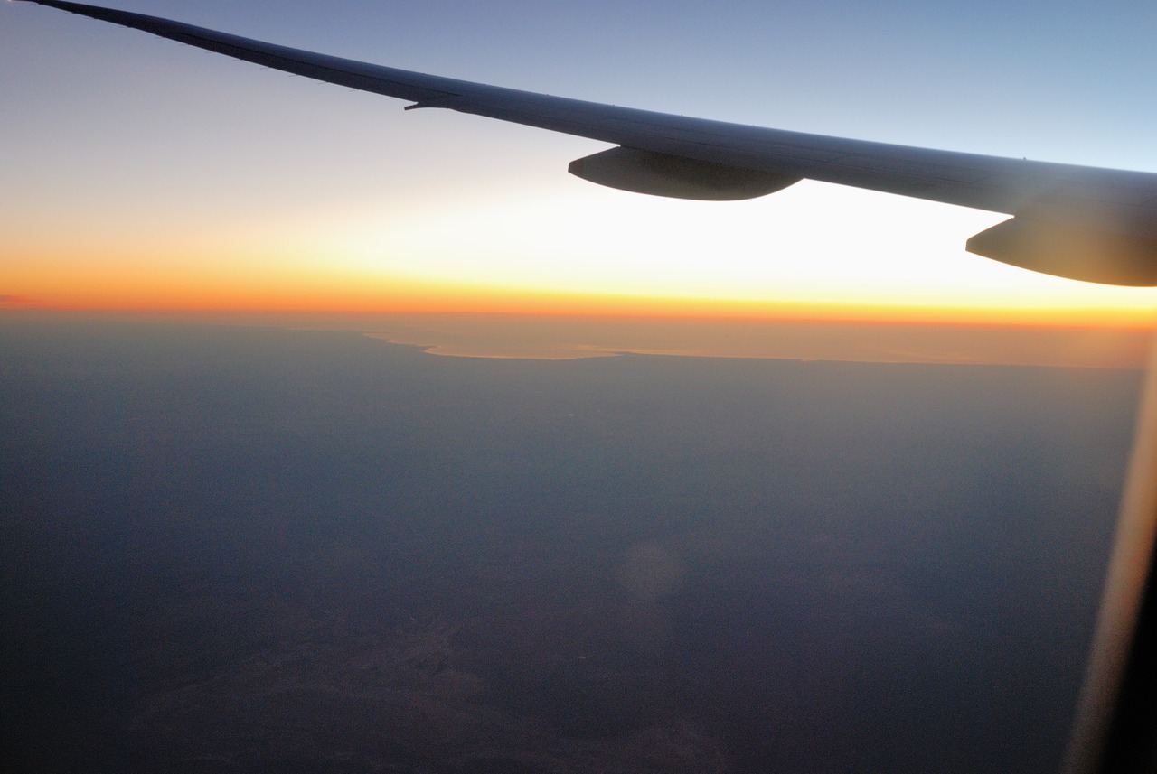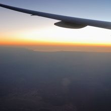 シドニーからシンガポールに向かう途中、エアーズロック上空を通りました。7時間位のフライトだったと思いますがシドニー出て3時間位で1万メートル上空を通過します。飛び立ってすぐにブルーマウンテンも通るのでちょっとした観光フライトです。大陸を抜けたあたりで機上の日没でした。