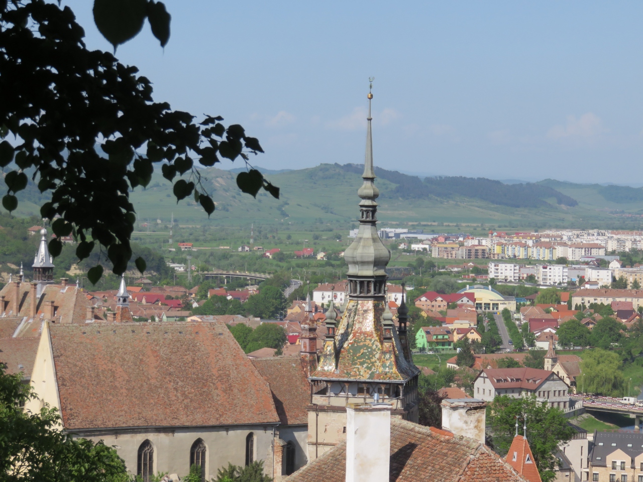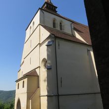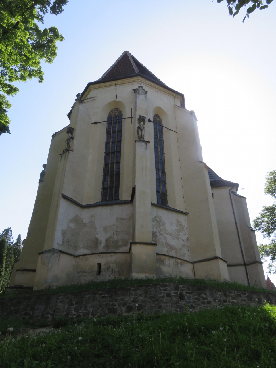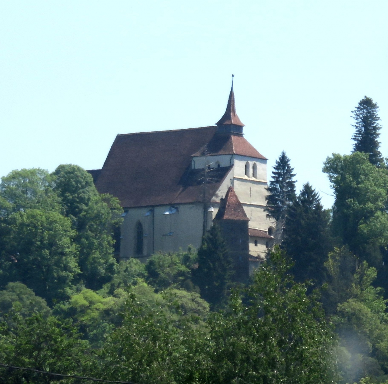 1525年完成のシギショアラの山の上に建つ教会。教会へは旧市街の中心の広場から南に少し歩いたところにある木造の屋根付き階段を上っていくことになり、車では行けない。私たちが行った時には上のほうからギターの生演奏が聞こえてきて、いいムードの中175段もの階段を何度も休みながら上り詰めた。暑いときはけっこうきつい。階段を上り終えたところは教会の裏手で、正面に回りこむと、かなり引いて撮らないと全体が写らないほど、大きなゴシック様式の教会が現れる。一人3レイを払って入ってみたが、正直言ってフレスコ画は復元されたものばかりで、特に目をみはるようなものはなかった。地下には墓地もあり、見学できたが、墓といってもほとんどが土で塗りこめられて、何もなかった。教会の前は共同墓地があるだけで、見通しもきかなかった。かろうじて教会裏手の木々の間から旧市街を覗くことができた。冬はもう少し見えるかもしれない。眺望を目当てに来る人達には物足りないだろう。