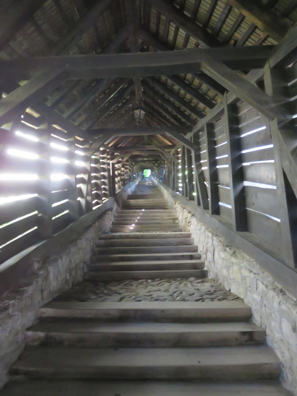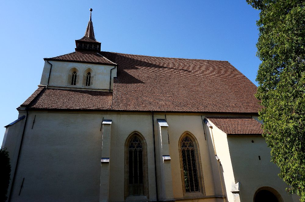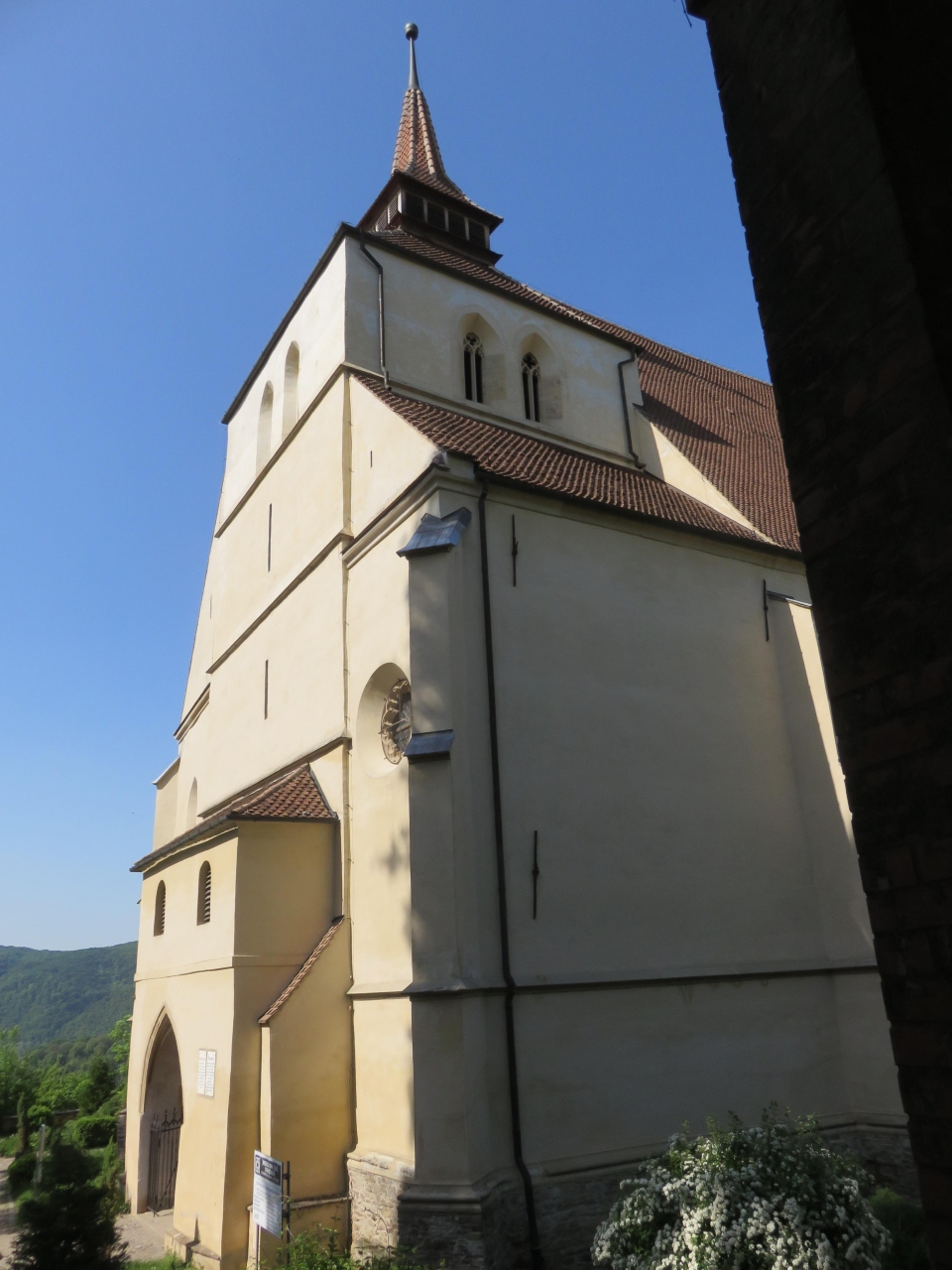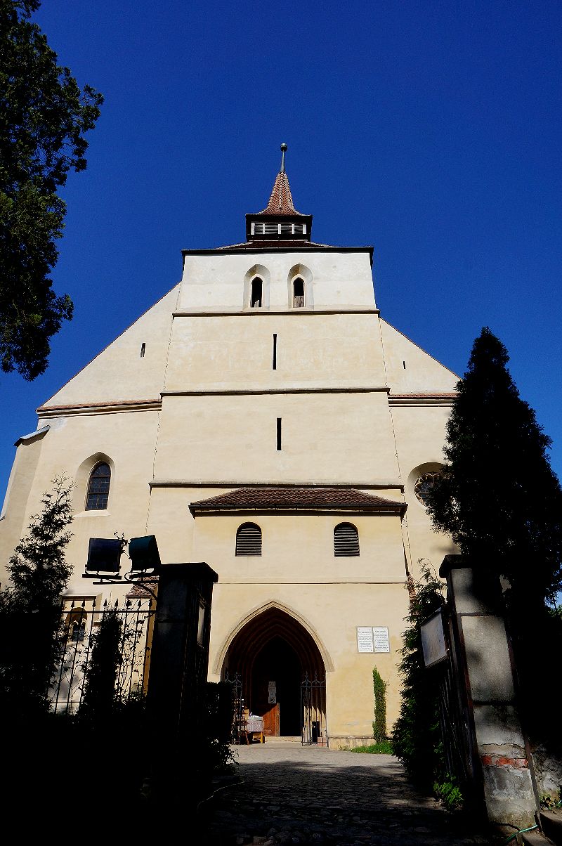 1525年完成のシギショアラの山の上に建つ教会。教会へは旧市街の中心の広場から南に少し歩いたところにある木造の屋根付き階段を上っていくことになり、車では行けない。私たちが行った時には上のほうからギターの生演奏が聞こえてきて、いいムードの中175段もの階段を何度も休みながら上り詰めた。暑いときはけっこうきつい。階段を上り終えたところは教会の裏手で、正面に回りこむと、かなり引いて撮らないと全体が写らないほど、大きなゴシック様式の教会が現れる。一人3レイを払って入ってみたが、正直言ってフレスコ画は復元されたものばかりで、特に目をみはるようなものはなかった。地下には墓地もあり、見学できたが、墓といってもほとんどが土で塗りこめられて、何もなかった。教会の前は共同墓地があるだけで、見通しもきかなかった。かろうじて教会裏手の木々の間から旧市街を覗くことができた。冬はもう少し見えるかもしれない。眺望を目当てに来る人達には物足りないだろう。
