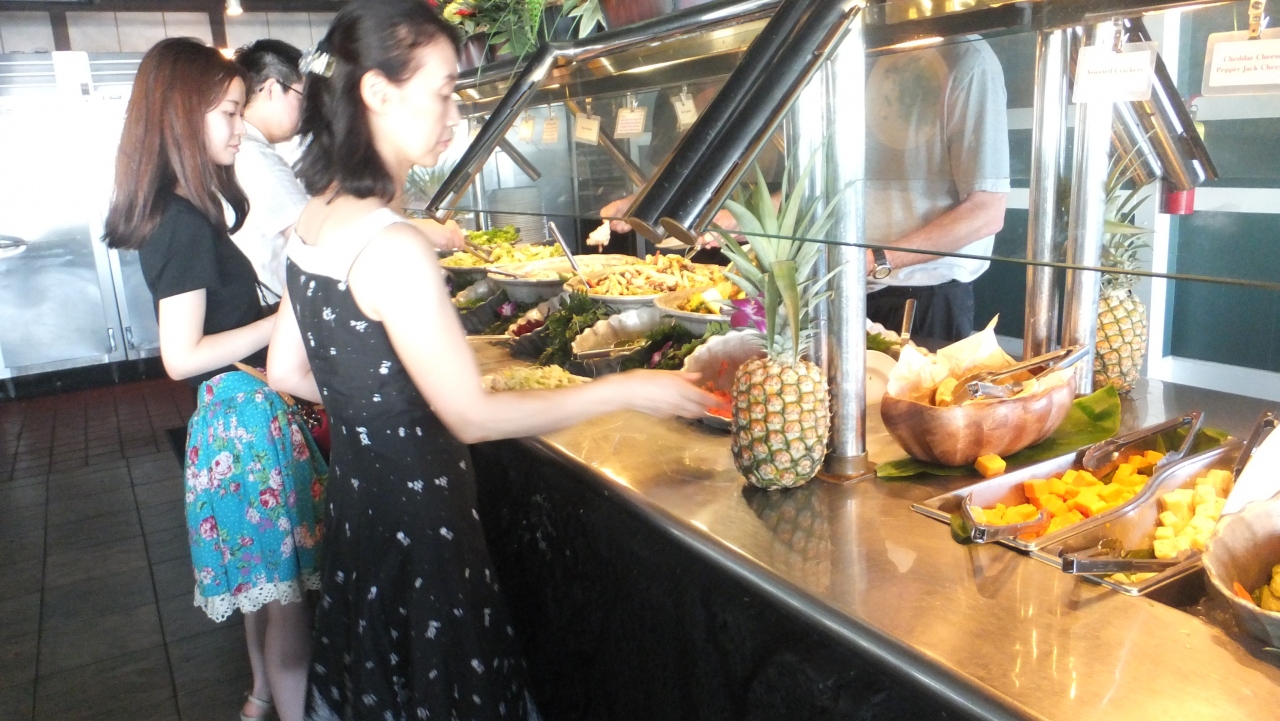 サラダやフルーツは食べ放題、肉やシーフードは各自でグリルするというBBQスタイル。コースは奮発して「ロイヤルディナープラン」。メインはトップサーロインステーキ&ロブスターでした(@79.94$)。