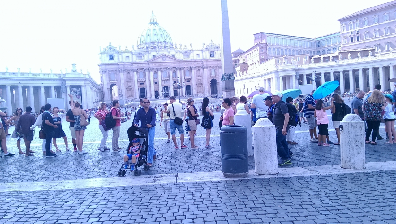 ローマ市内かコルソ通りから歩いてサンピエトロ広場まで来ました。大聖堂に入る予定でしたが、人が多すぎてあきらめました。なんでも前の列に行けるように手配する人がいて、一人40ユーロを払って入ったと言っていました。10年ほど前の夏にも来ましたが、その時はこんなに混んでおらず、大聖堂にも楽には入れたのですが。でもバチカンに来ただけでもよいでしょう。それだけの価値はあります。