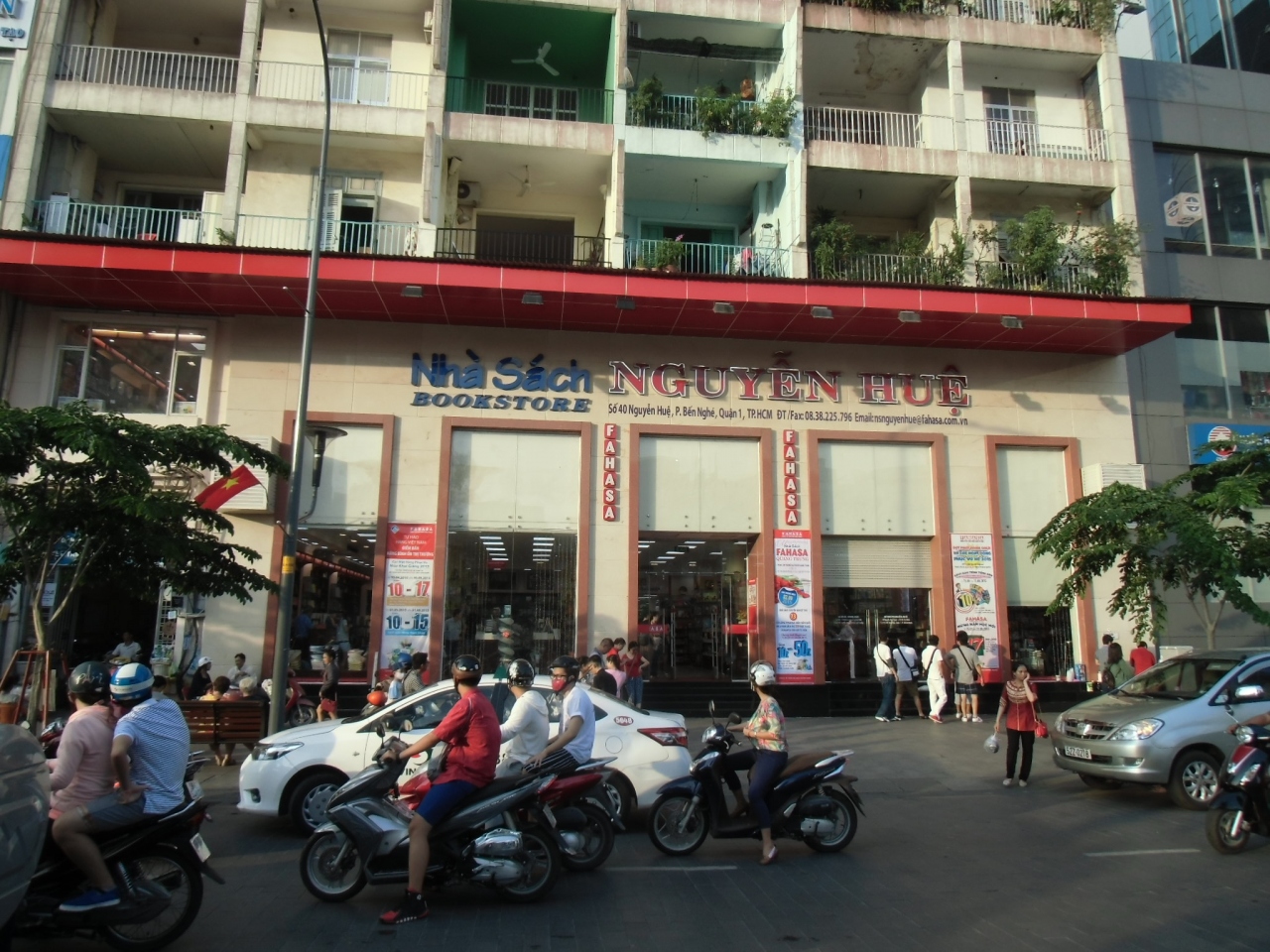 グエンフエ通りのラッキープラザの横にあります。カバンなどの手荷物は、入口左奥のカウンターで預けます。ロッカーの鍵を渡されます。店内は意外と奥まであり、3階まであります。年末にはベトナムのカレンダー(旧暦と新暦が併記してあるもの、毎日の日めくりなど)を売っていますので、お土産になります。まだベトナムの歌手のDVDやCD、かわいい便箋などの文具も売っていますので、見ていても楽しいですよ。