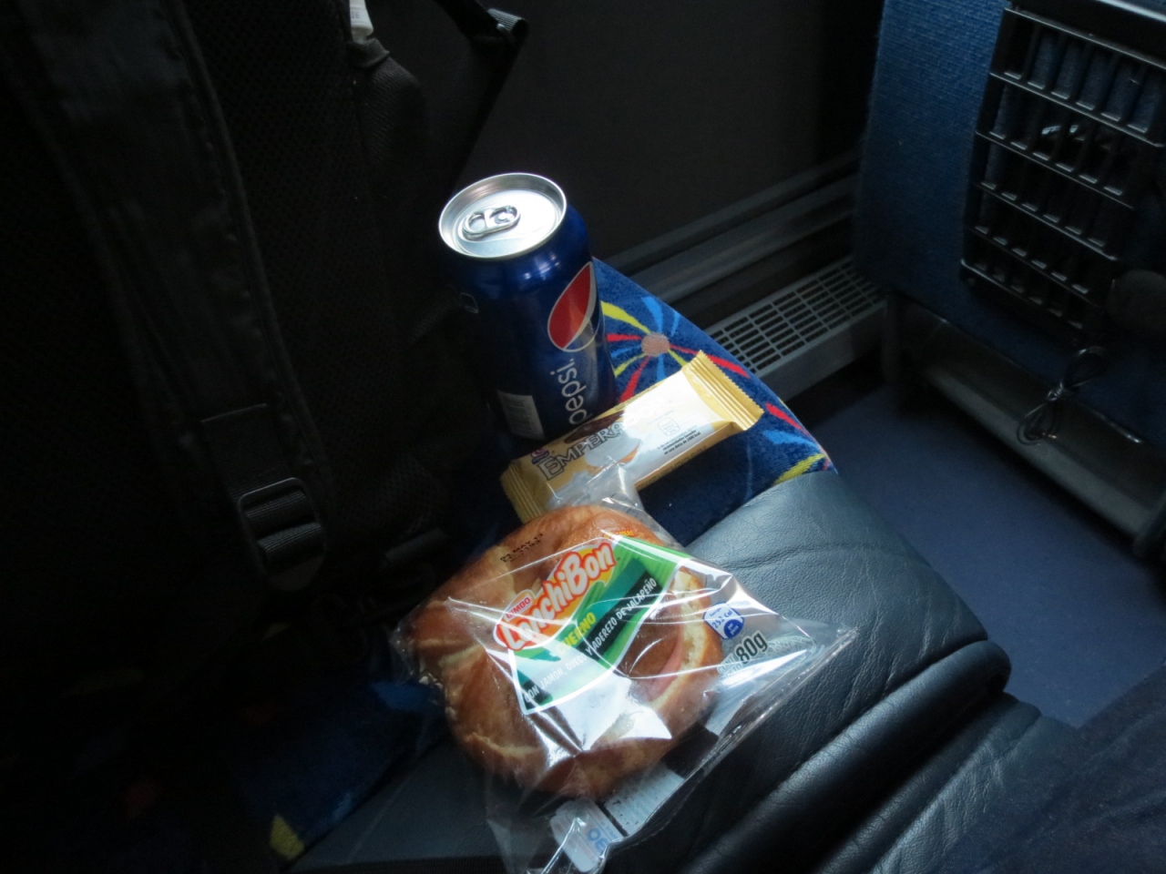 移動当日は、11時台のバスでしたが、パン1個、菓子1個、水かコーラの軽食が配られました。車中飲食禁止ではないようです。(自分でも揚げパンを買っておいたのですが)
