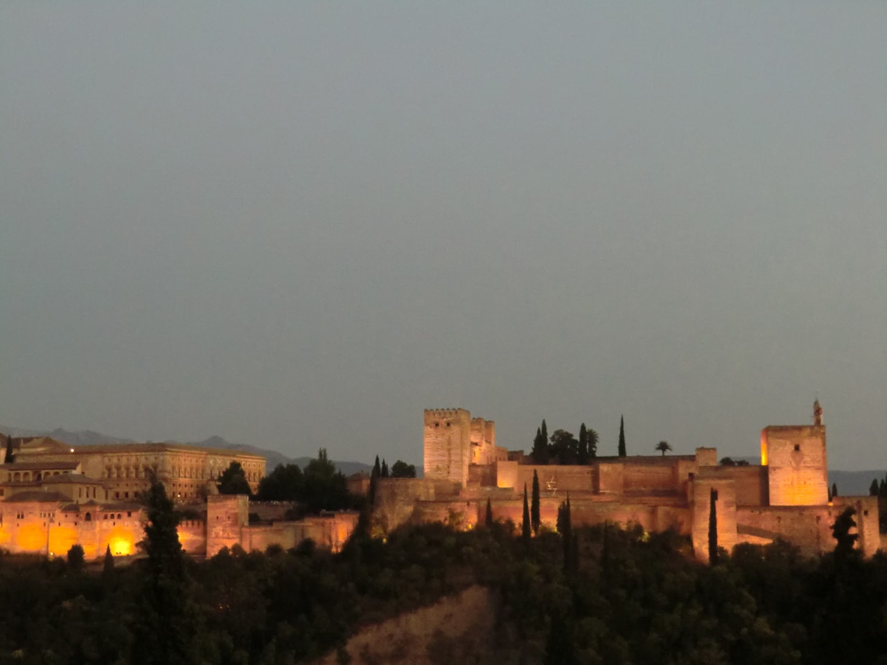 安くあげるならばヌエバ広場からアルハンブラ・バスが分かりやすいですが、歩いていくこともできます。そして、広場で夕暮れと夜景の宮殿を見る。