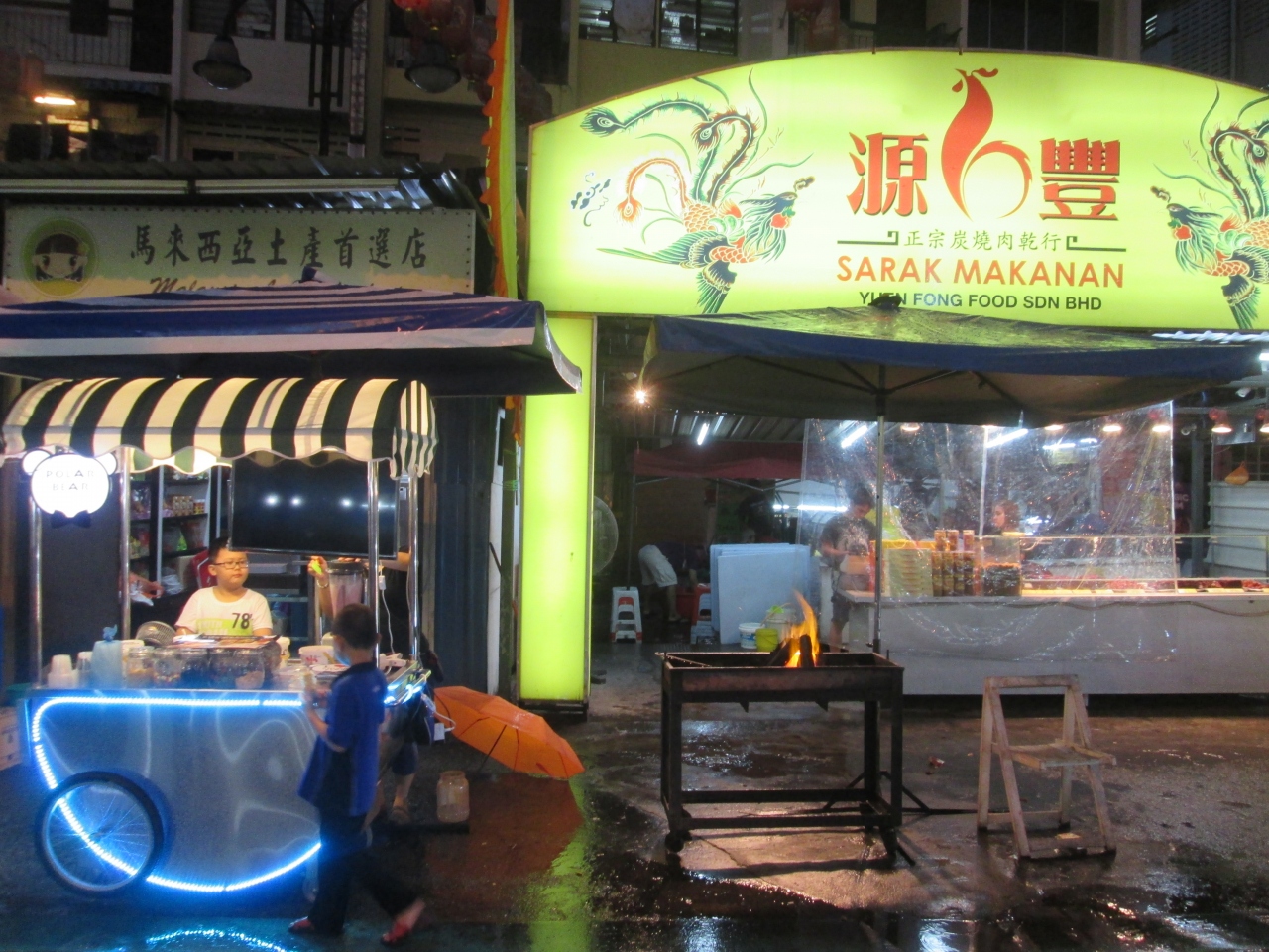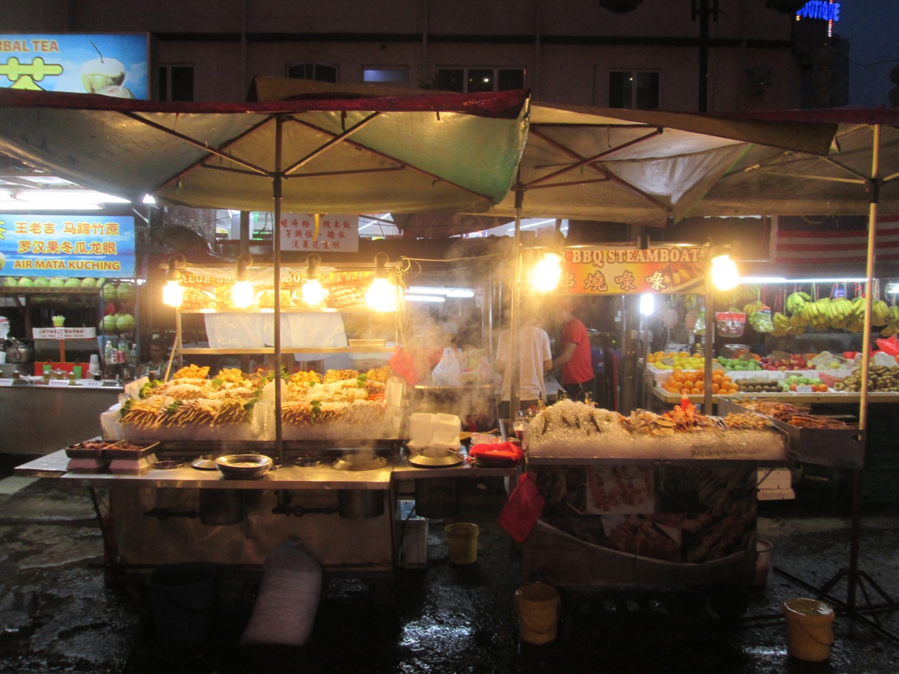 約1年ぶりに訪れたアロー通りには、日本のガイドブックにも掲載されている有名な屋台街があります。1年前と屋台群の光景は変わりませんが、新しい店やメニューのお店を見かけました。炭火を利用して作る料理や、セルフで食べるマレー式フライのお店がありました。