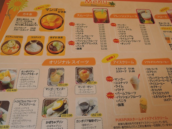 アンコールクッキーショップに併設されているモイモイは、ガイドブックに掲載されているためか、ほとんどが日本人でした。メニューも日本語が用意され店員も簡単な日本語が話せるので注文に不自由することがありません。マンゴーカキ氷の他にも色々なスイーツがあります。