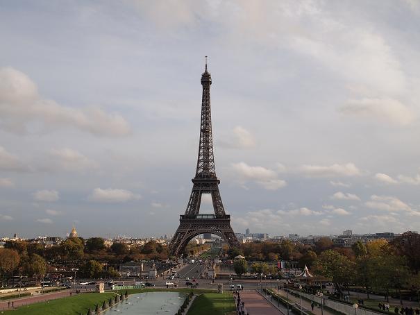 メトロのトロカデロ駅から地上にでてシャイヨー宮を通り抜けると、すぐにエッフェル塔が見えます。塔の真下に行くには、駅の出口から10分ほど歩きました。