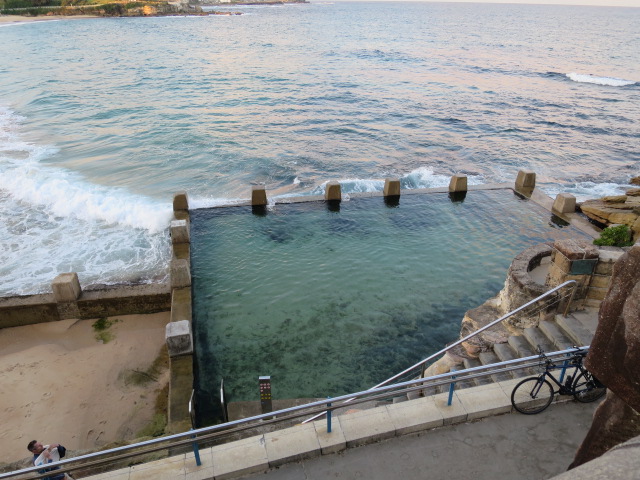 景色はグラント保護区側から見ると太陽と正対してしまうが、岬とビーチの景色がなかなかいい感じ! ちょっと面白いのはビーチの端の岩場に、四角のプール的なモノがあり、そこでも泳いでいる人がいたが、これはサメが出た時のため?? なんだろう??