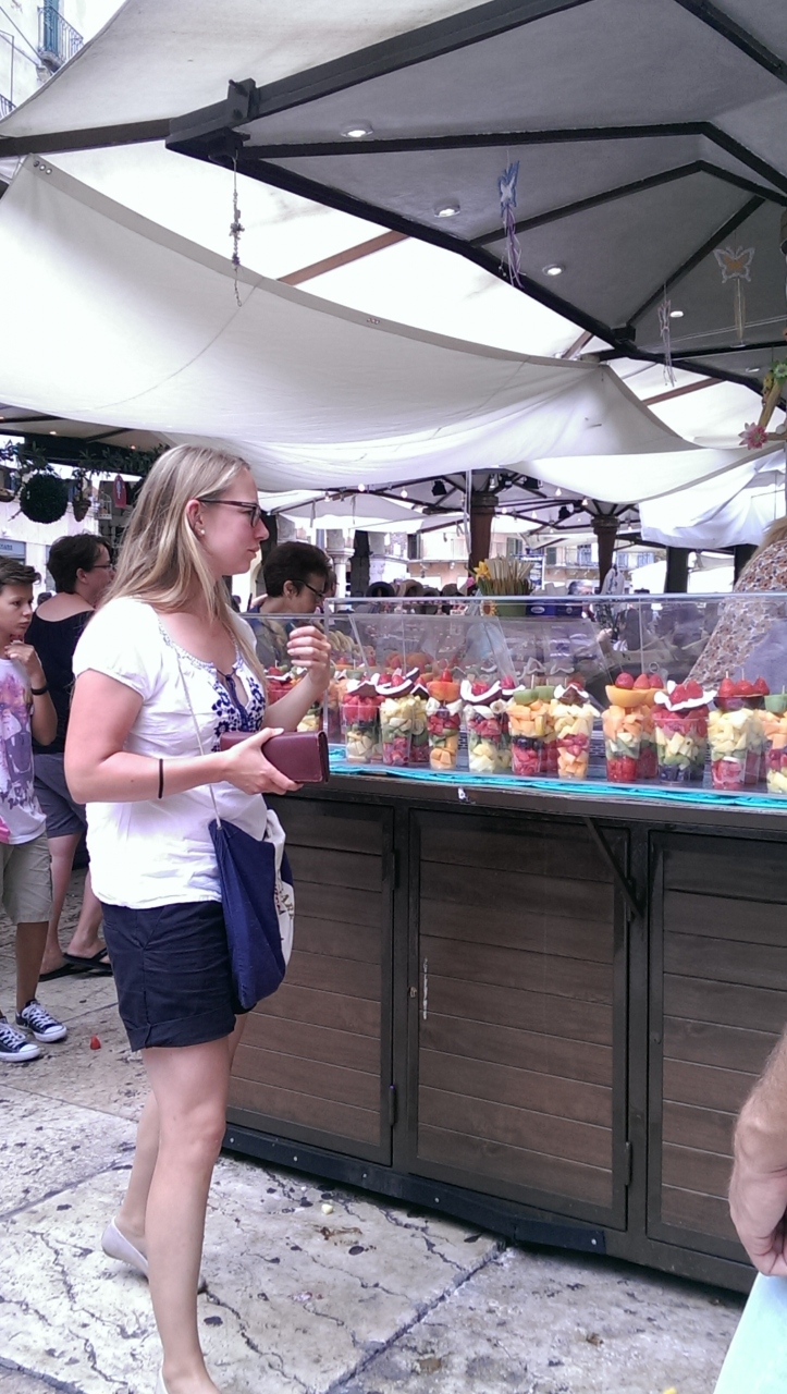 ジュリエッタの家から通りに出てすぐのところにこの広場があります。市場が開かれていて、人々でにぎわっていました。うるさい音楽などなく、落ち着いていました。北イタリアは治安は良いです。スムージーやフルーツを切ったものなど、たくさんの食欲をそそる食べ物がありました。