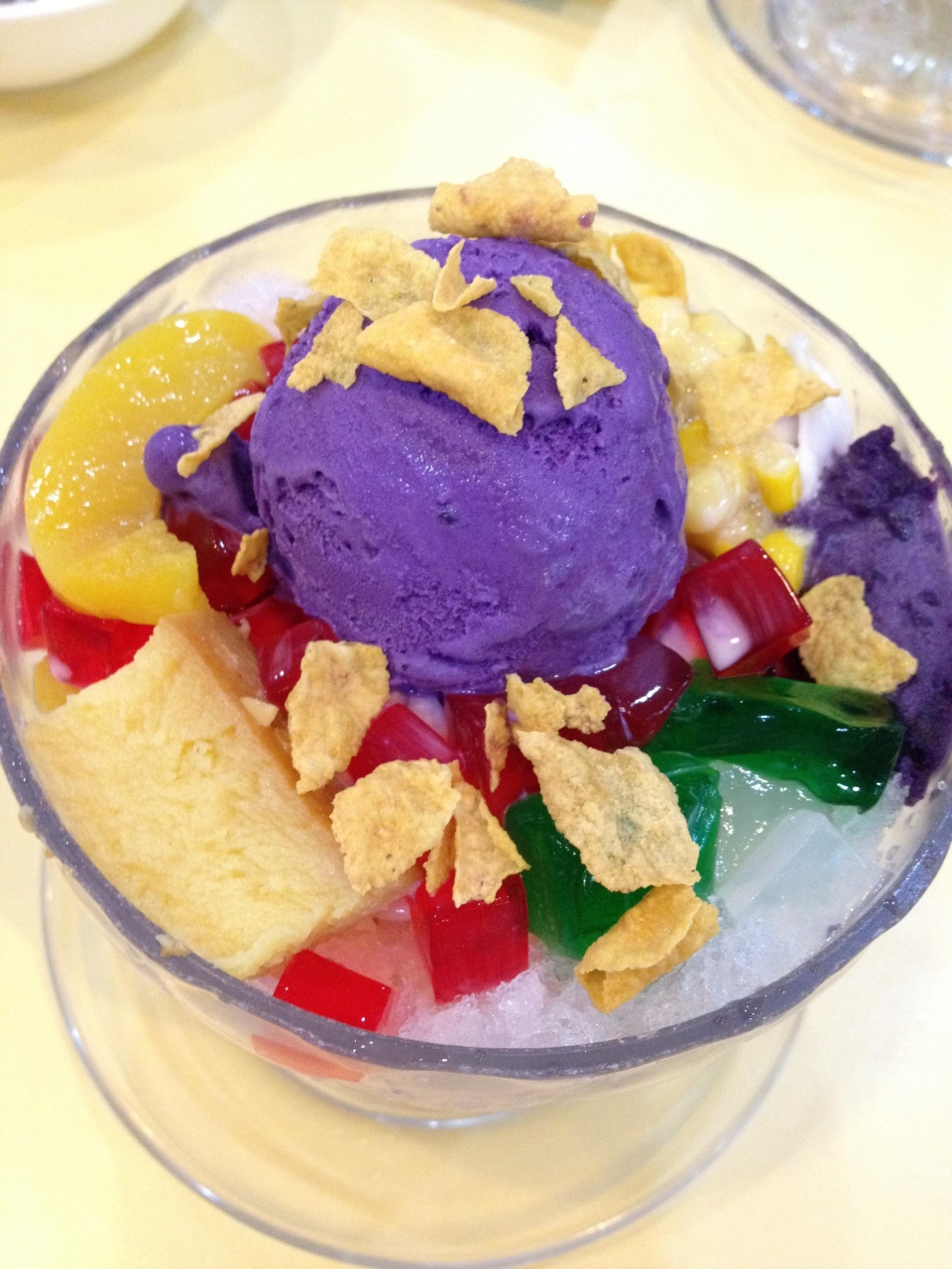 フィリピンを代表するデザートといえば、ハロハロ。ミニストップとは違う本物を味わいたくてアヤラモールへやってきました。まったく食欲をそそらない紫色(芋)のアイスですが、食べてみると普通でした。でも、期待していたほど美味しい食べ物ではなかったです。