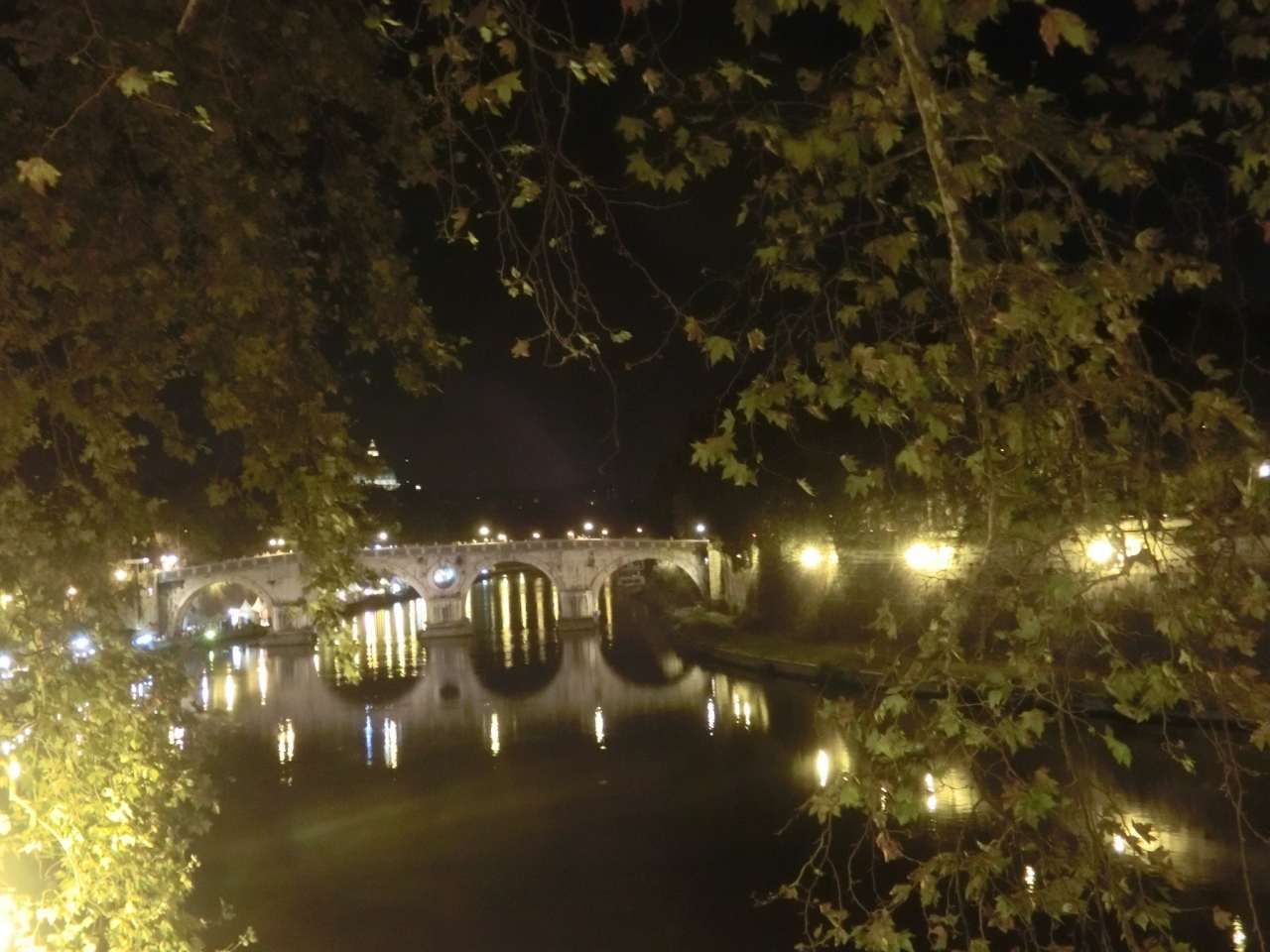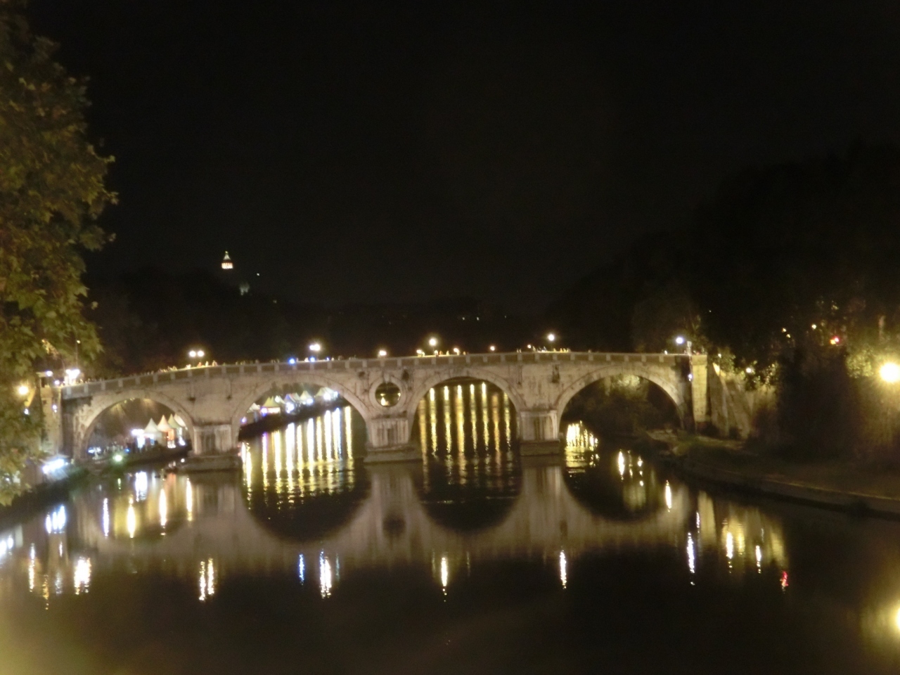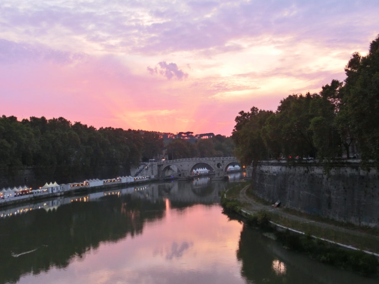 テベレ川の橋から夕日を見ることができました。夕焼けも 夜も 昼間も この川からの景色は 楽しめました。昼 バチカンに歩いて行く時 橋を渡ると そこからサンピエトロ寺院が 見えました。夜は 川岸に 夜店がでて 大賑わいでした。