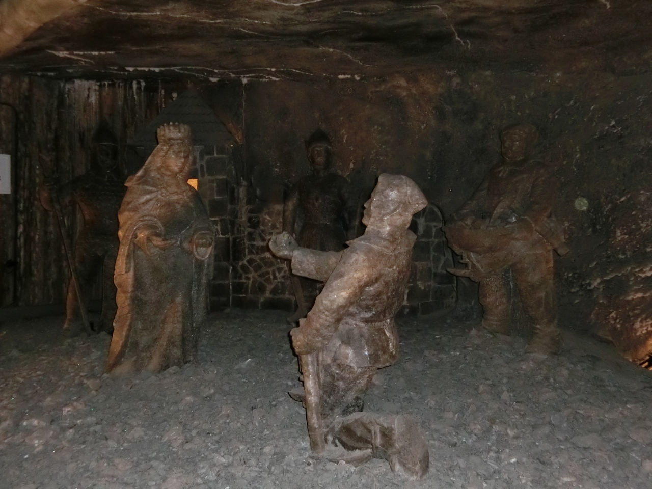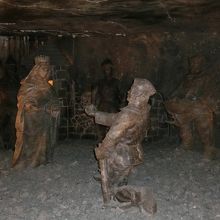地下327m、全長300?以上の規模ですが観光用に公開されているのは地下135m、長さ約3.5?です。地上からは一箱9人乗りのエレベーターで一挙に下に降りて坑道探検開始です。途中さまざまな彫像がありますがこれは抗夫が岩塩を削って作ったものです。また採掘の歴史を人形等で展示しています。