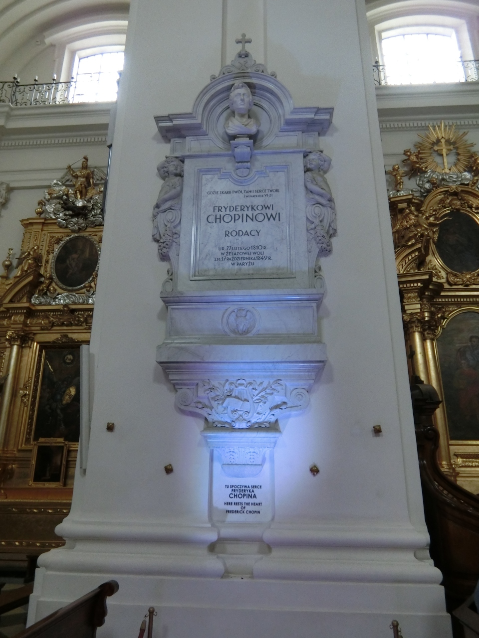 内部の主祭壇は金色に輝き荘厳な印象でした。そして柱には遺言により死後ポーランドに戻ってきたショパンの心臓が収められた柱がありました。死してなお祖国の土が踏みたいというショパンの思いが伝わって来るようです。