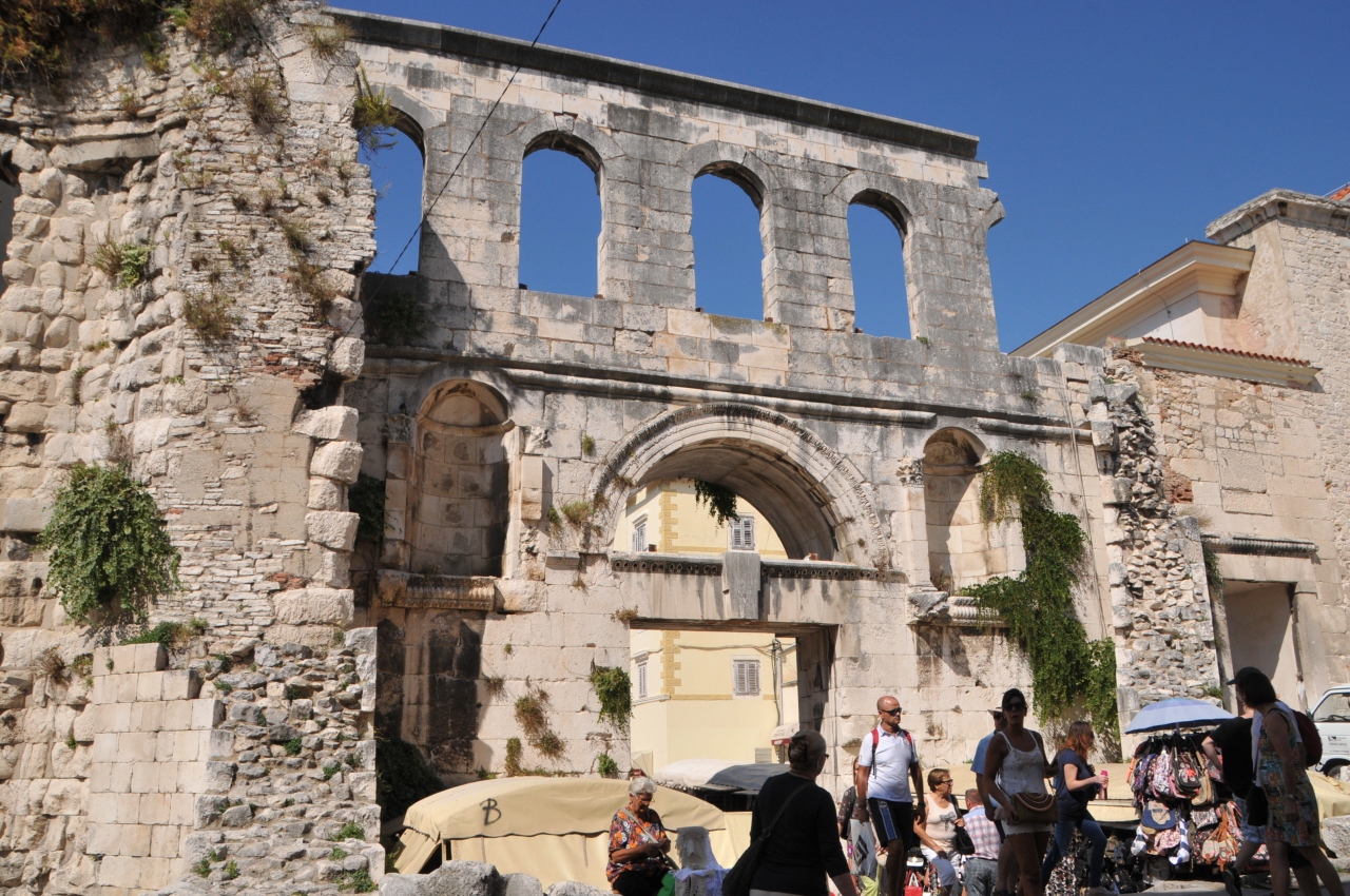 スプリット旧市街の東側にある門です。まるでかつての神殿跡のような雰囲気で、他の門よりは開放的な雰囲気、遺跡に入るのだという気にさせてくれます。門の外は青空史上になっており、野菜やらお土産やらフルーツやら花やらが売られています。
