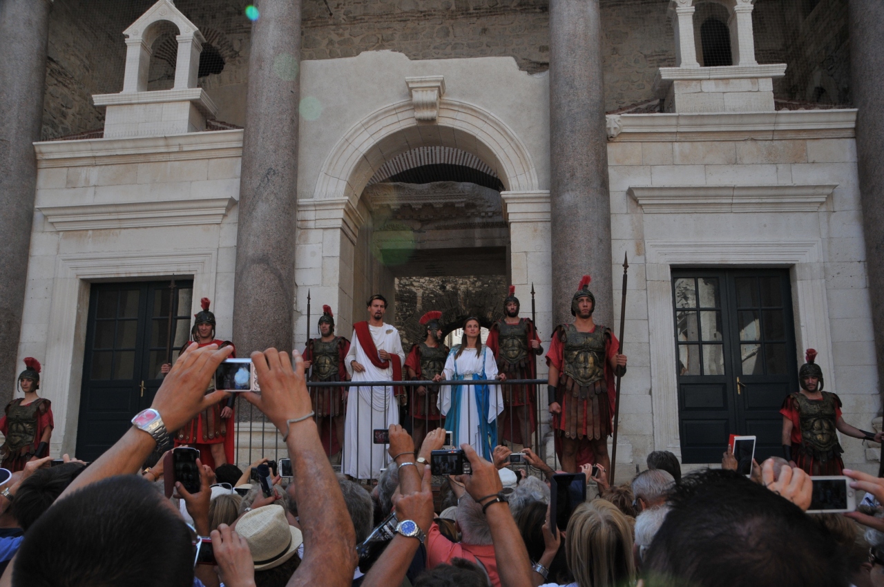 旧市街の中心に当たる広場で、観光案内所があります。カフェなどが周囲にあり、観光客でにぎわっています。昼の12時になるとローマ時代の皇帝と妃に扮した男女が現れ、観光客に向かって挨拶をしてくれます。夜になるとライトアップされます。