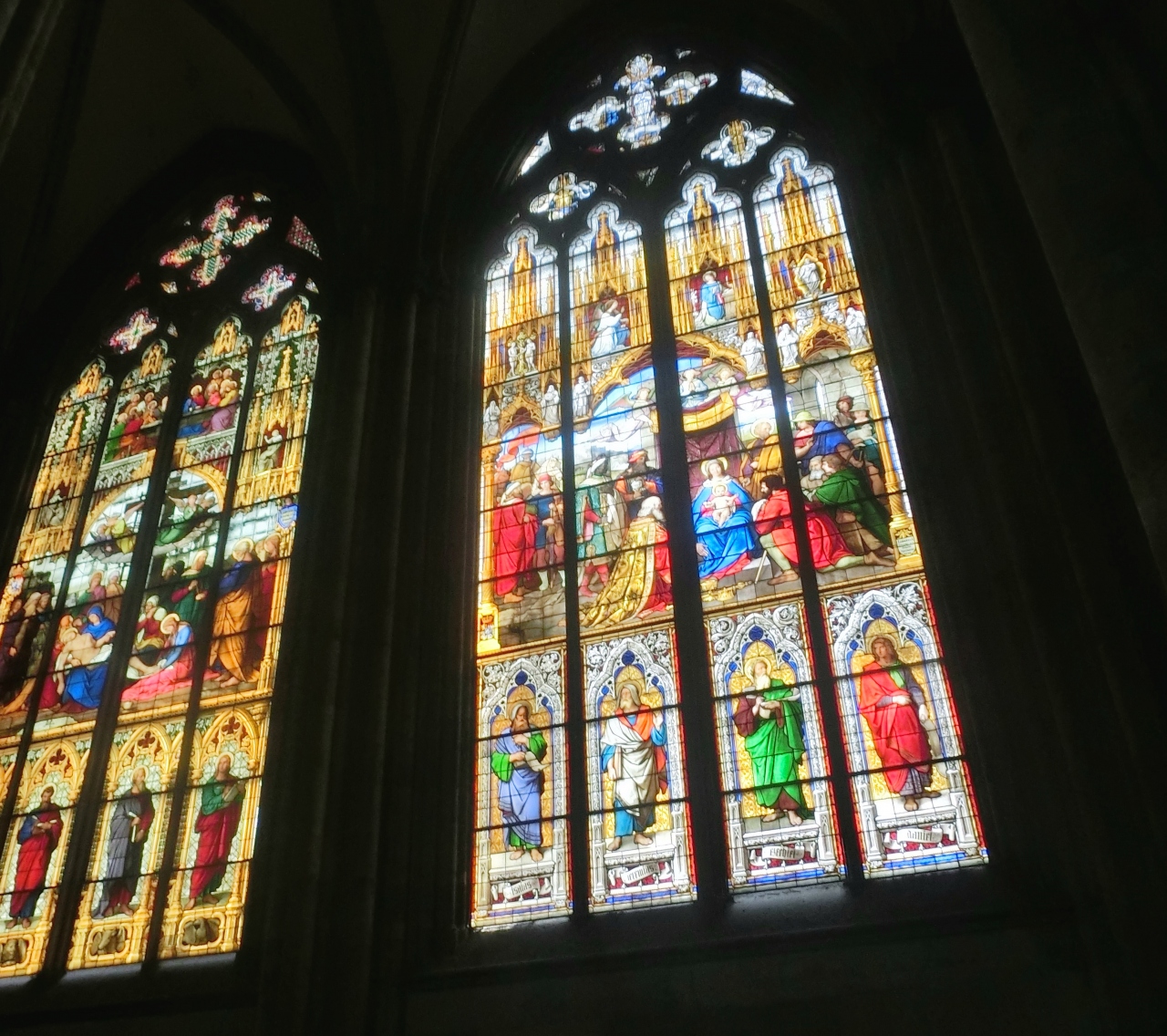 中の天井の高さ、ステンドグラスの壮大さ、当方の3博士の聖なる棺……と見所もふんだんにある。