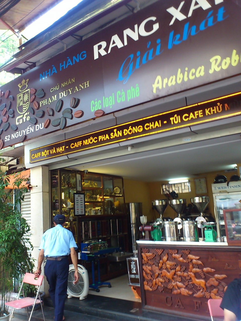 宿泊したハノイのホテル日航から朝の散歩で近くのティエンクアン湖を散策している時に見つけたカフェです。ベトナムコーヒーは少し甘い香りがするのが特徴です。量は少し少なめで、独特のドリッパーでコーヒーを入れます。飲んだコーヒーが美味しかったので、お土産に豆も購入。何種類かある豆の中から選んでその場でパック詰めしてくれます。